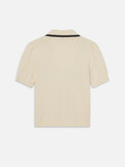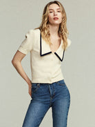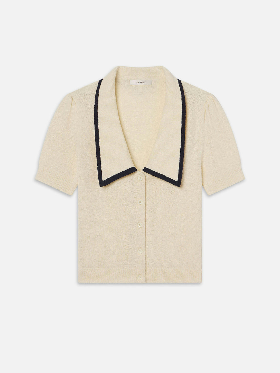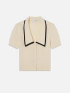 A new shape, knit from our bestselling textured yarn. This soft cream sweater features a sailor collar trimmed in dark navy and short sleeves, striking that balance between nostalgic charm and everyday wearability. A nod to tradition—with a lighter touch.
