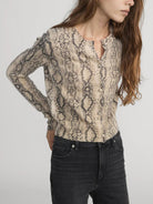 A luxuriously soft cashmere cardigan in the pattern of the season: snakeskin. Finished with cashmere-covered buttons for a unique polished touch. A classic crewneck silhouette with full-length, slim-fitting sleeves.