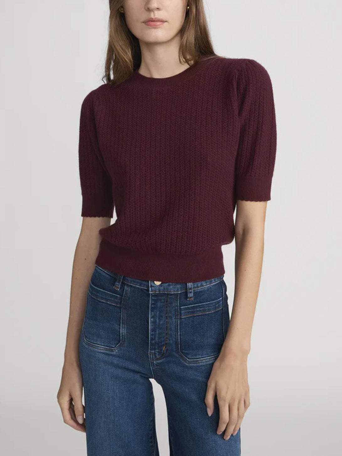 This short-sleeved cashmere sweater is knit in an airy chain-pointelle stitch. The sleeves are finished with feminine, softly scalloped edges. In a fresh seasonal cabernet colorway.