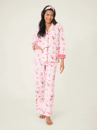 Festive and spirited, this three-piece flannel set is made from soft cotton in a classic twill weave, complete with a button-front top, relaxed drawstring pants, and a matching headband. The blush-pink backdrop is covered in candy cane martinis, mint sprigs, and cheery little bows, finished with contrast piping and a cuff that cheekily reads “Tini Time”—made for holiday happy hours, sweet nightcaps, and drifting off afterwards.