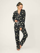 Shaken, stirred, or straight to bed—this martini-print flannel set brings cocktail lounge vibes to cozy time. Made from soft cotton in a classic twill weave, it includes a button-front top with contrast piping, relaxed drawstring pants, and a matching headband. A cheeky way to toast to comfort, whether you’re enjoying at-home happy hour or drifting into dreams.