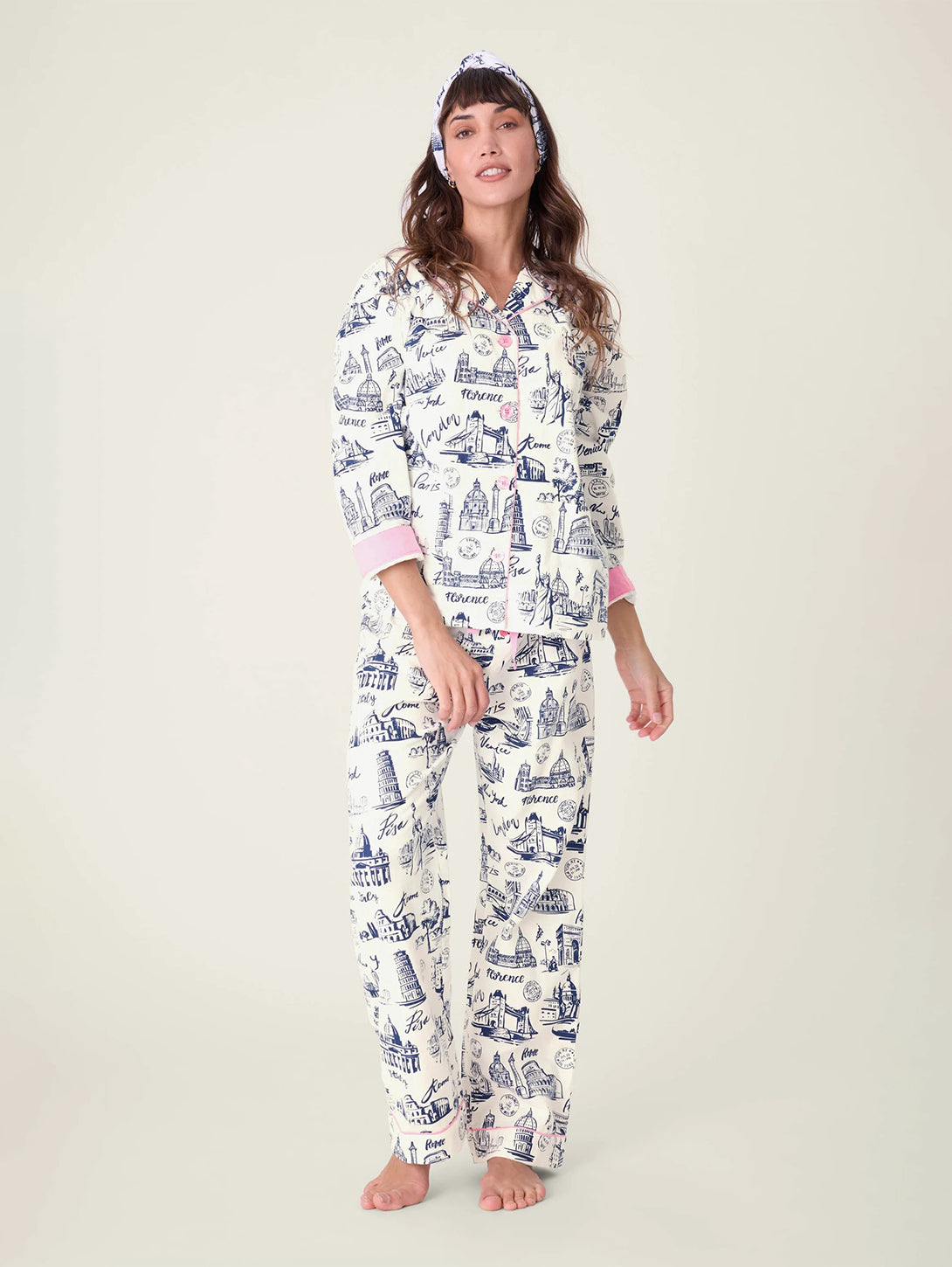 - Women’s 3-piece pajama set in white with navy city landmark print.