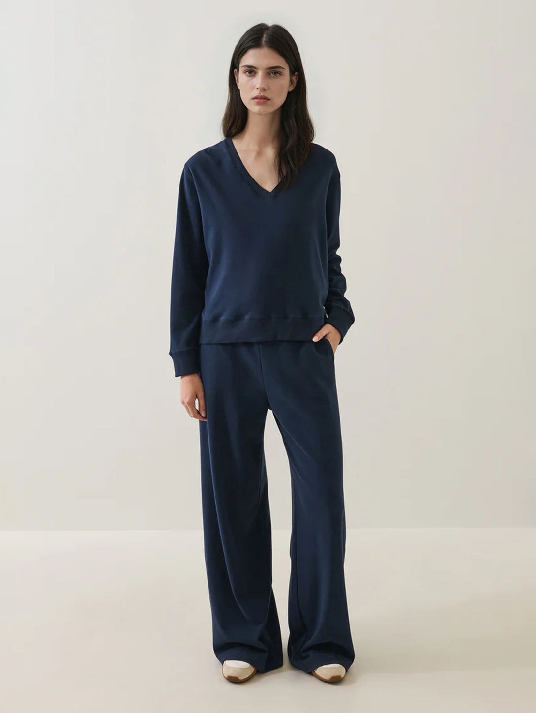 Crafted in a luxuriously soft brushed pima cotton, this piece is cut in a relaxed silhouette featuring a flattering v-neckline and slight drop shoulder. Style with our relaxed drawstring jogger for a refined yet comfortable lounge look.