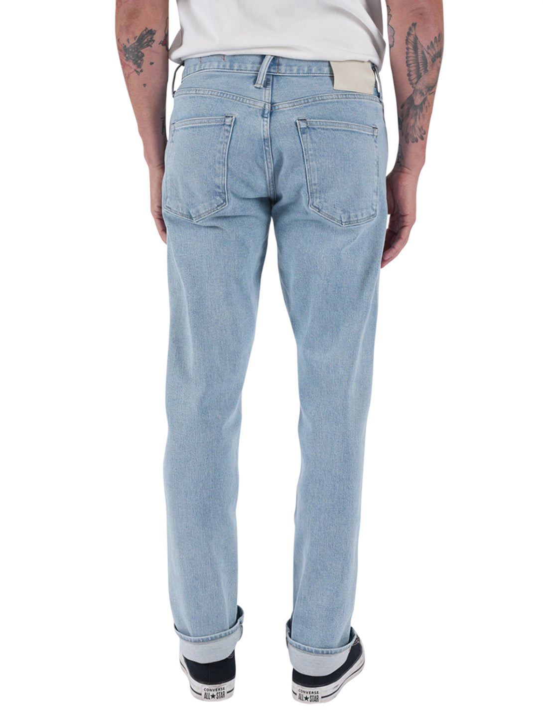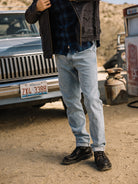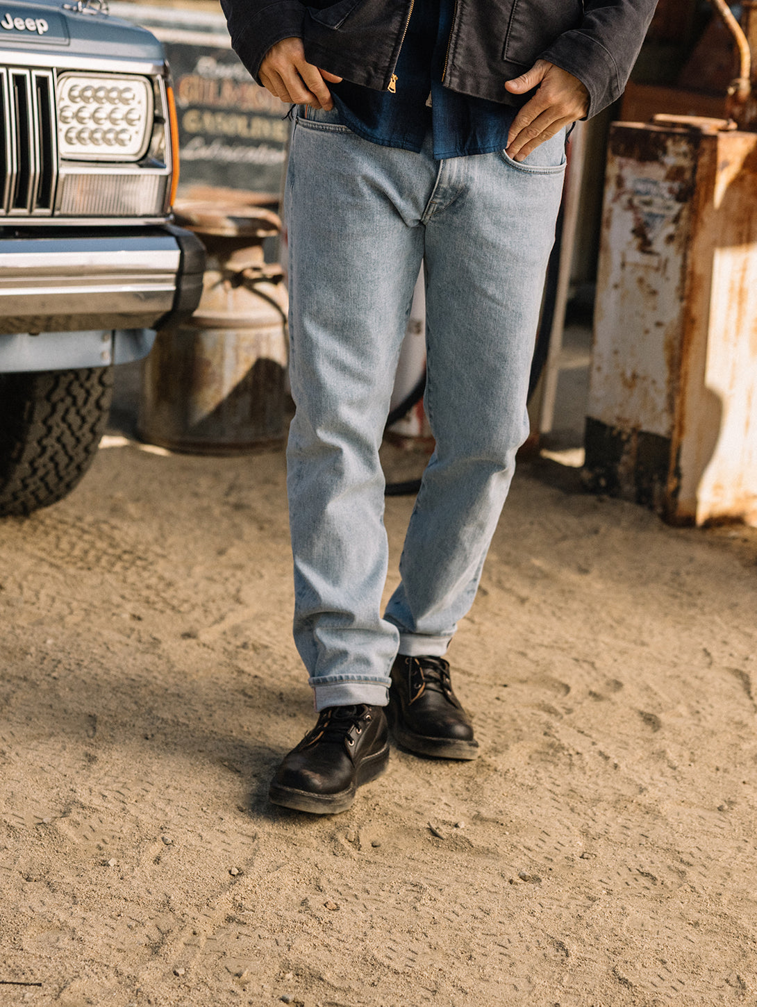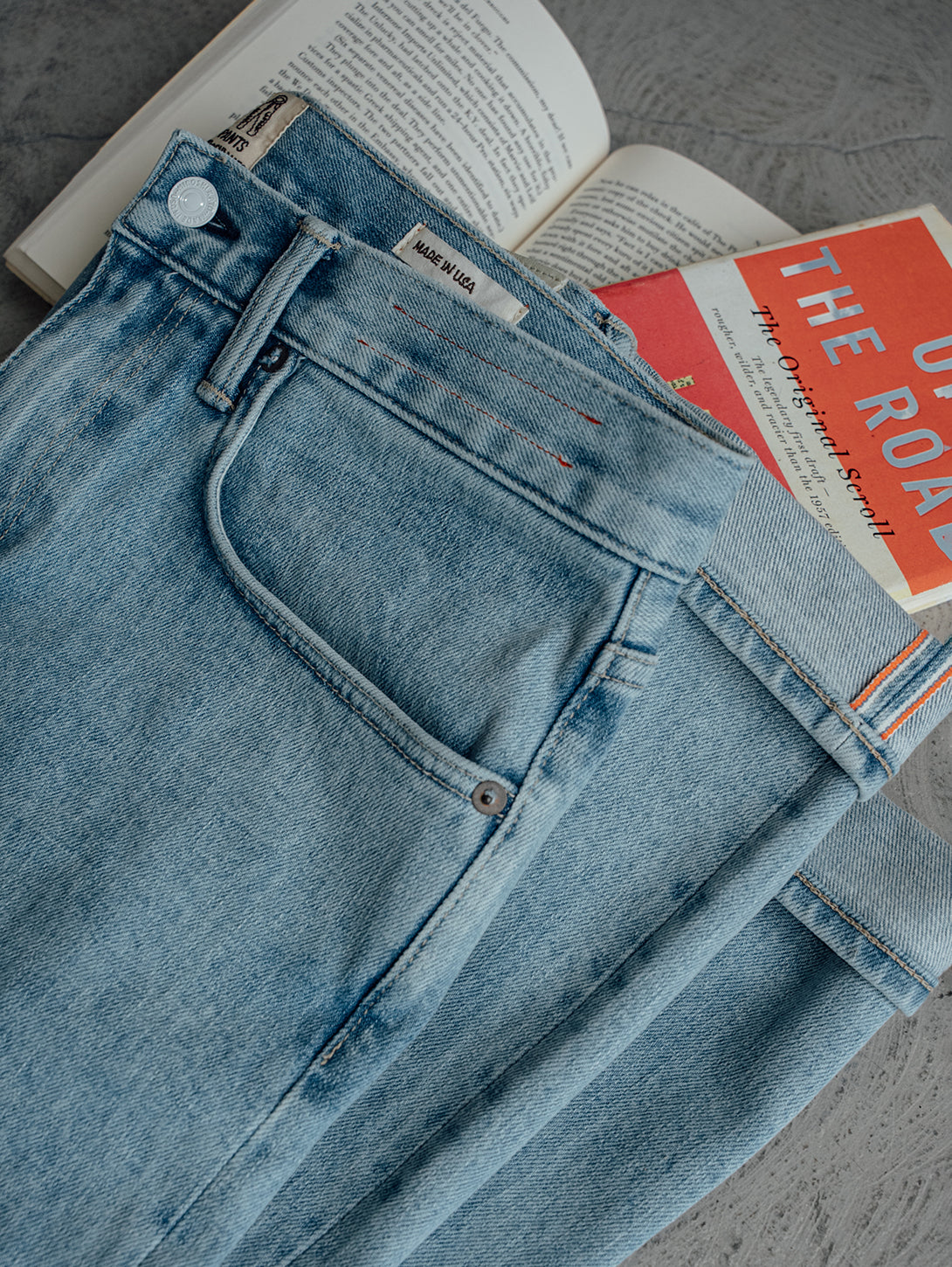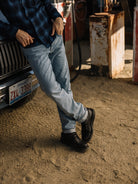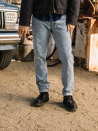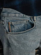 The Pen Slim fit in our signature indigo 14oz 4 way stretch selvedge, has undergone a heavy bleach wash to strip almost all the indigo down to its last remnants, leaving behind a pale blue hue that evokes sun-bleached summer nostalgia.