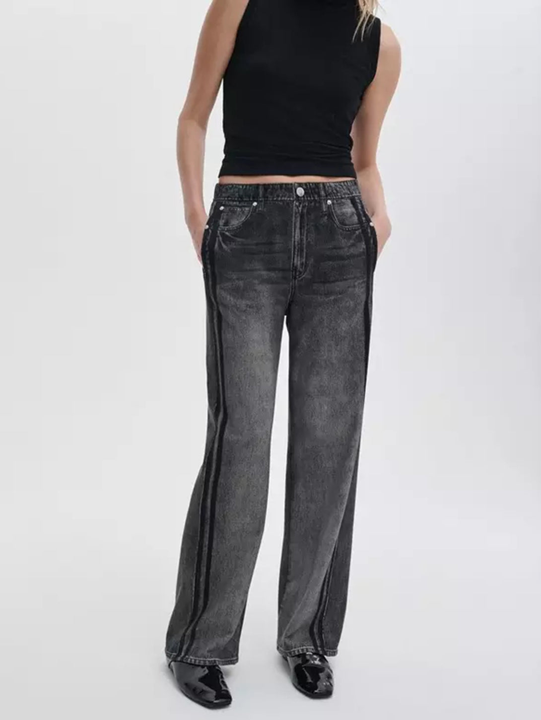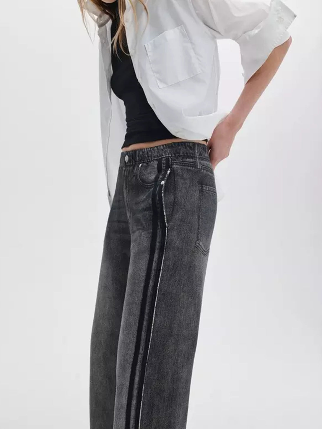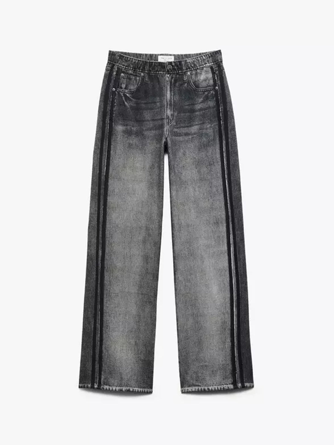 Miramar, our revolutionary printing technique, makes any material look like denim. These wide-leg track pants are cut and sewn from cotton terry cloth that's ultra-soft on the inside and printed on the outside to look like your favorite jeans. Featuring a pull-on elastic waistband and hidden side-seam pockets, the mid-rise style further achieves its comfortable fit and feel with its sporty side stripes, other pockets, and denim details digitally printed on the fabric.