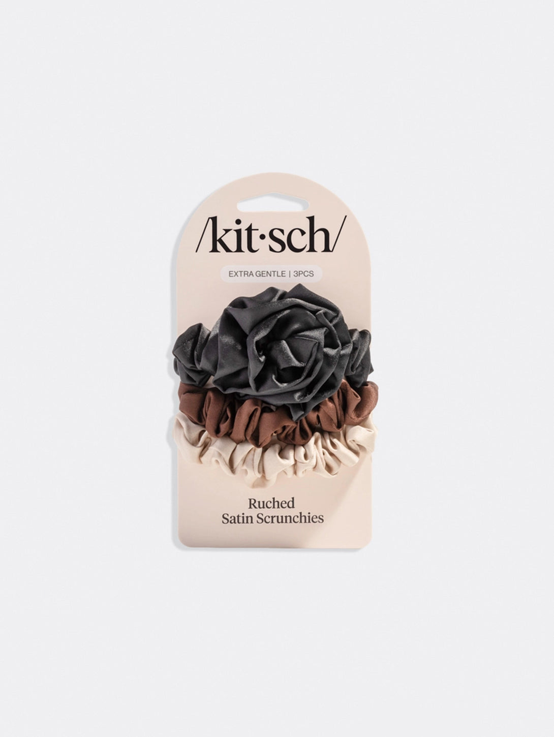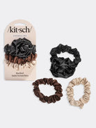 Add a touch of elegance to your hair styling routine with the Rosette Ruched Satin Scrunchies 3pc Set in Black by Kitsch. These scrunchies offer a chic, sustainable solution for your hair accessory needs. Made with ruched satin, they add a sophisticated flair while keeping your hair neatly in place. Perfect for all hair types, they are gentle on your locks, preventing any damage or breakage. Enjoy this stylish trio from Kitsch, a brand renowned for creating elevated beauty solutions.