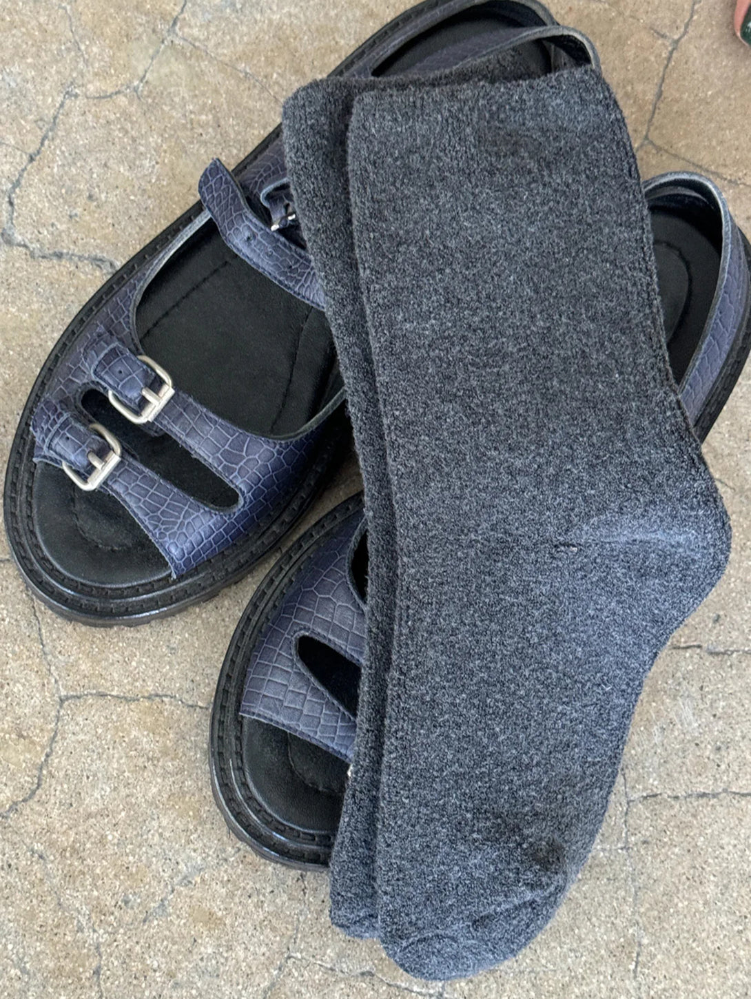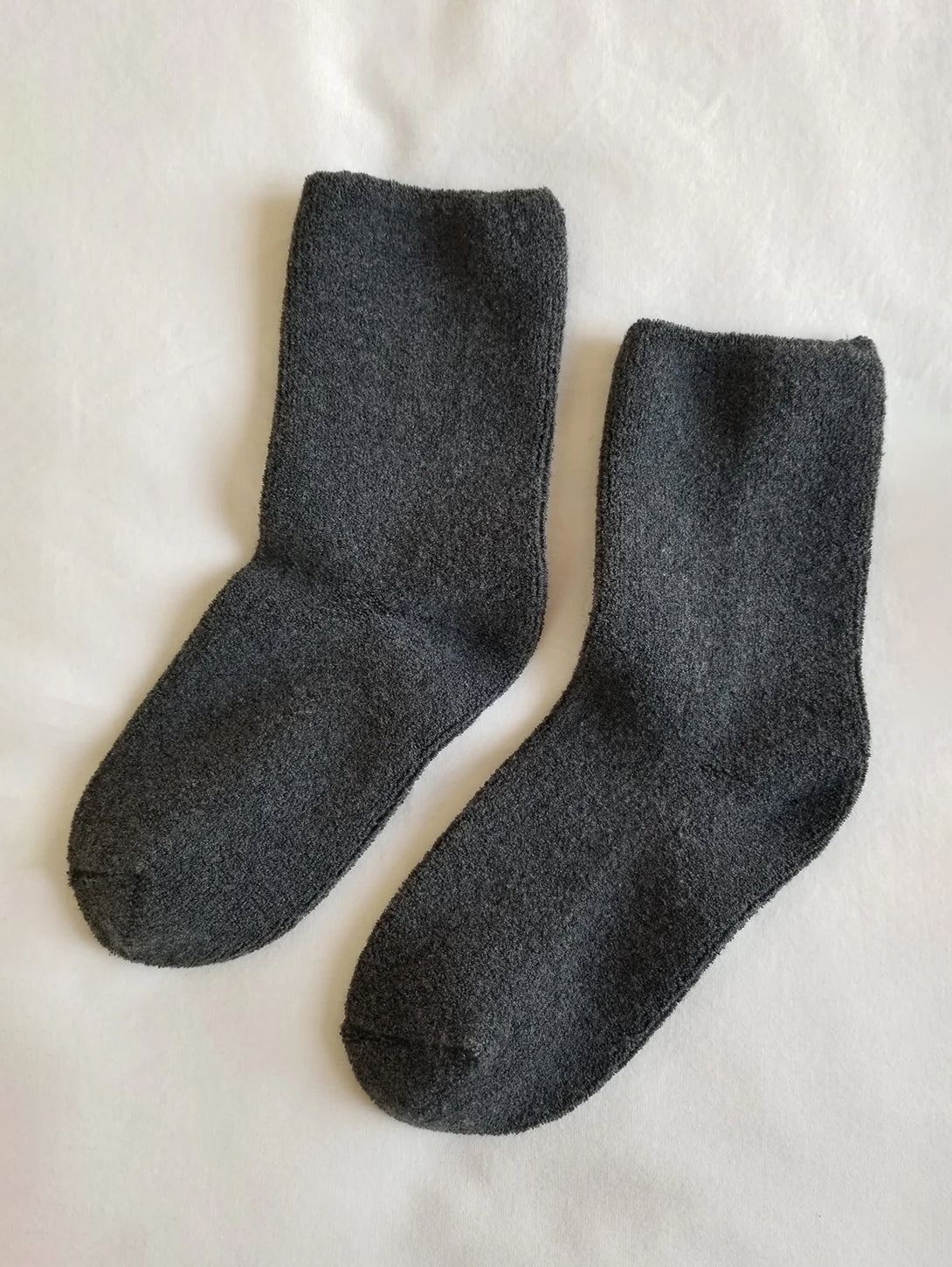 Like walking on clouds! These are hands down the comfiest and cutest socks to wear all year long. Made from a fluffy, terry cotton blend yarn that is breathable and unique. While the exterior is fluffy, the interior is smooth and airy. Pair them with your favorite clogs or slides and enjoy the extra cushion.