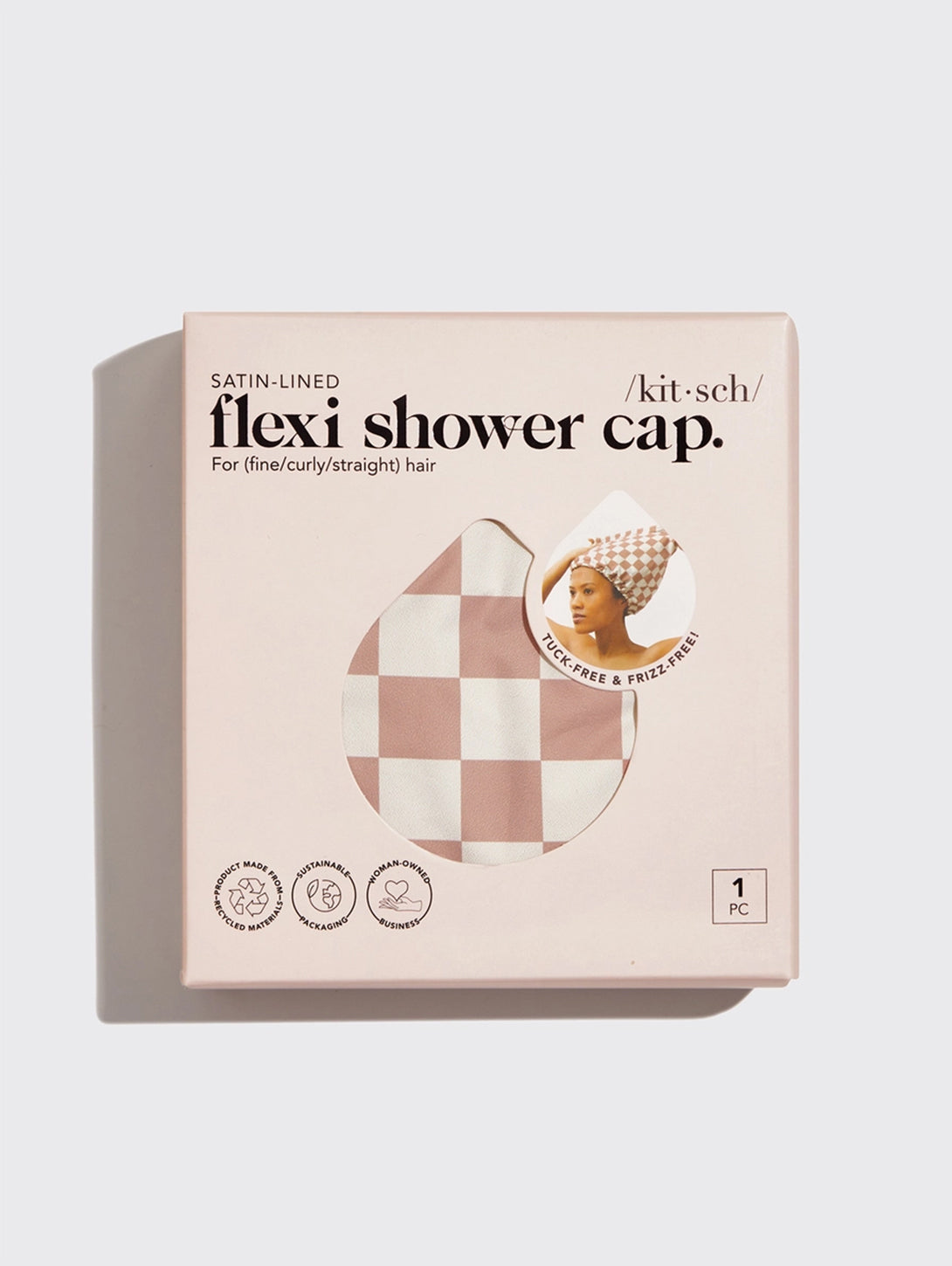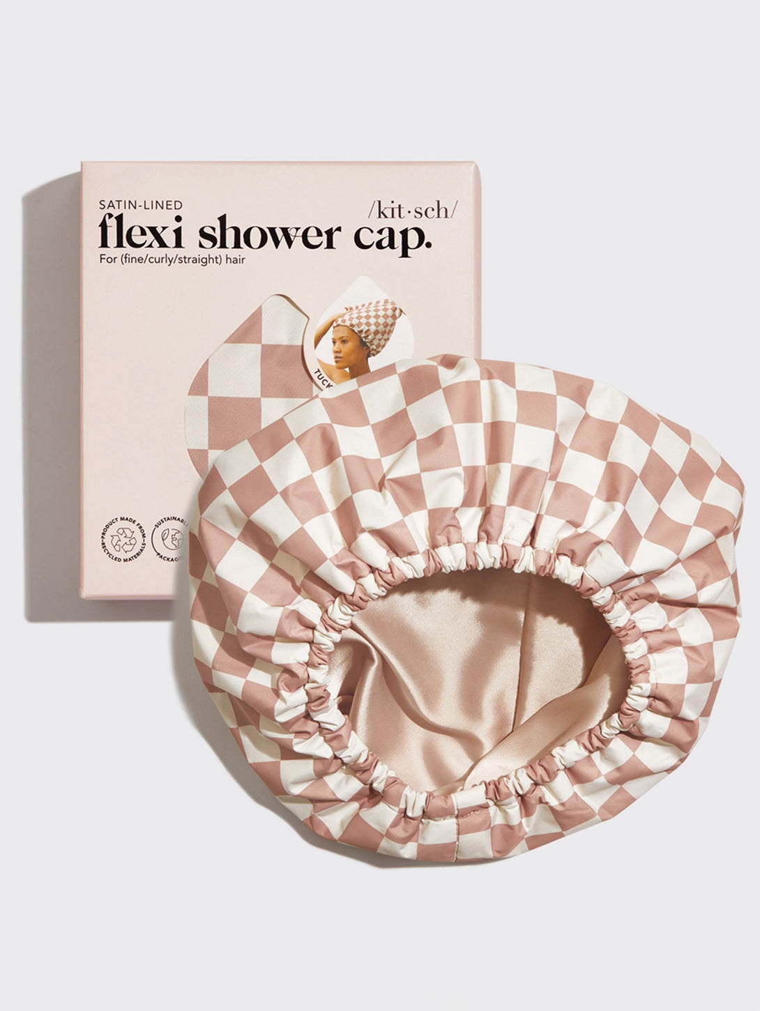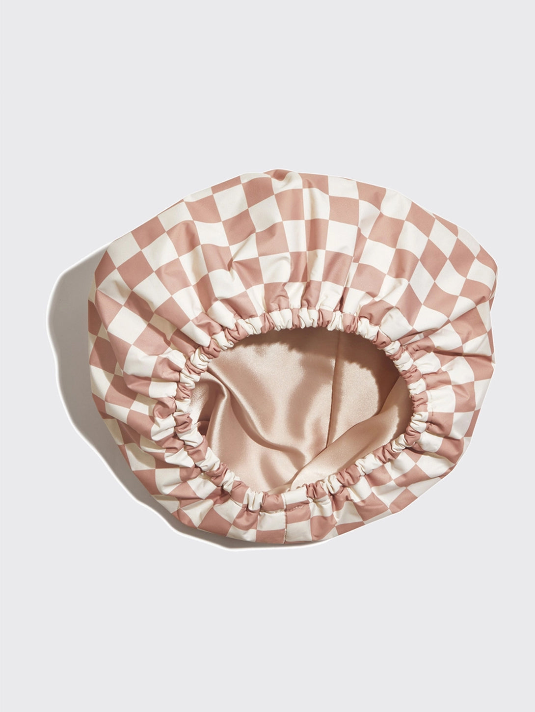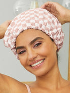 Keep your hair dry and fabulous with the Satin Lined Flexi Shower Cap in Terracotta Checker! Its extra-wide, waterproof shell fully covers your hair without messing up your style, while the open-back design lets loose strands stay dry too. The adjustable back wire ensures a snug, comfy fit for most hair lengths. Inside, a luxurious satin lining tames frizz and a super-soft layer pampers you for a spa-like shower treat. Say goodbye to soggy hair days and hello to playful, protected locks!