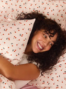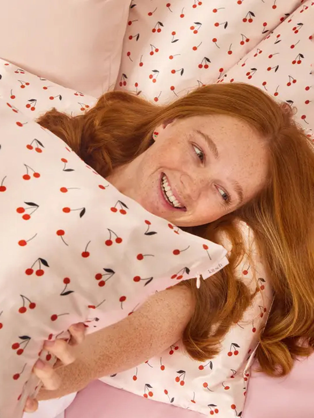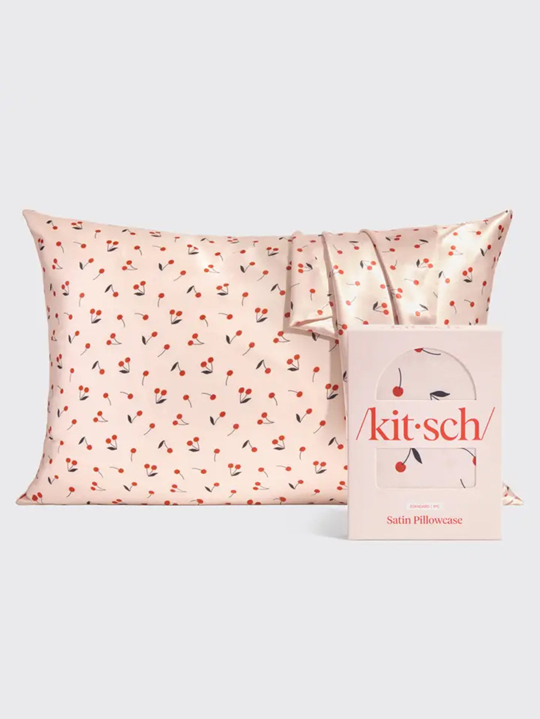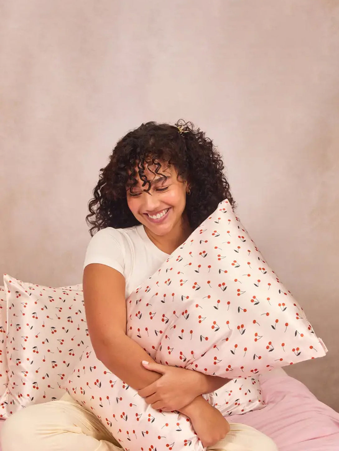 Elevate your beauty rest with this luxe satin pillowcase. Features a chic cherry print from our Very Cherry Collection. Helps to tame frizz & reduce breakage by creating less friction. Helps reduce breakouts by absorbing less moisture and dirt Why You'll Love This. Helps to prevent facial creases from sleeping. Aids skin in retaining moisture. May help minimize the look of lines and wrinkles. Gentle on skin, hair, eyelashes, and eyebrows. Stays cool all night. OEKO-TEX® Certified: This certifies that our satin is safe, sustainable, and environmentally friendly.