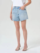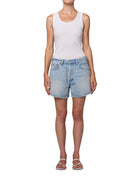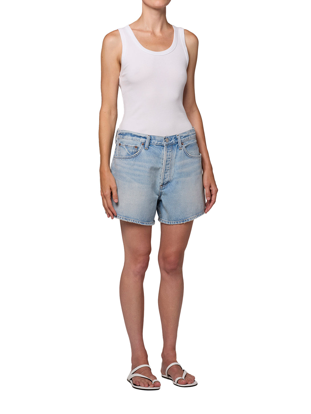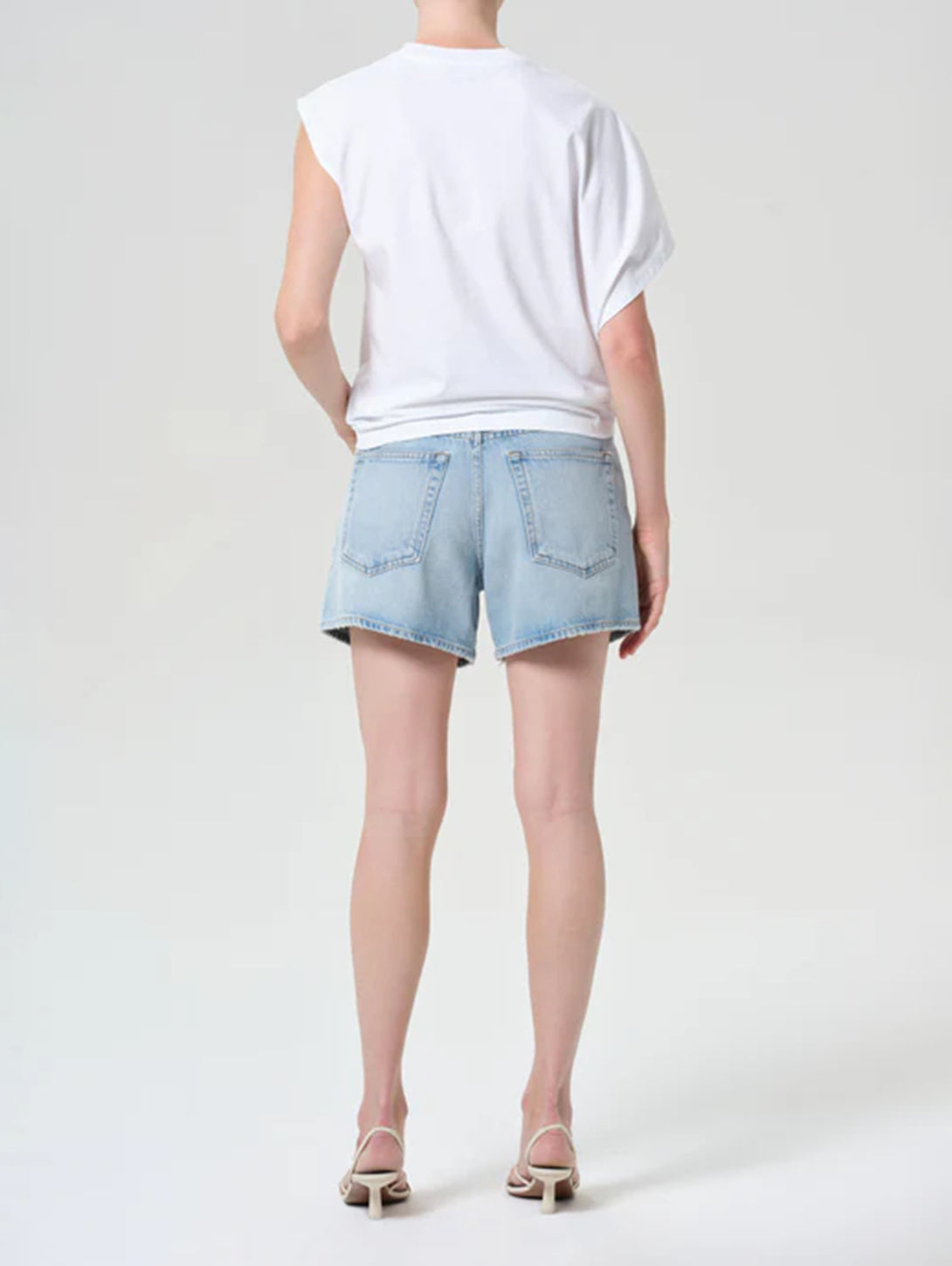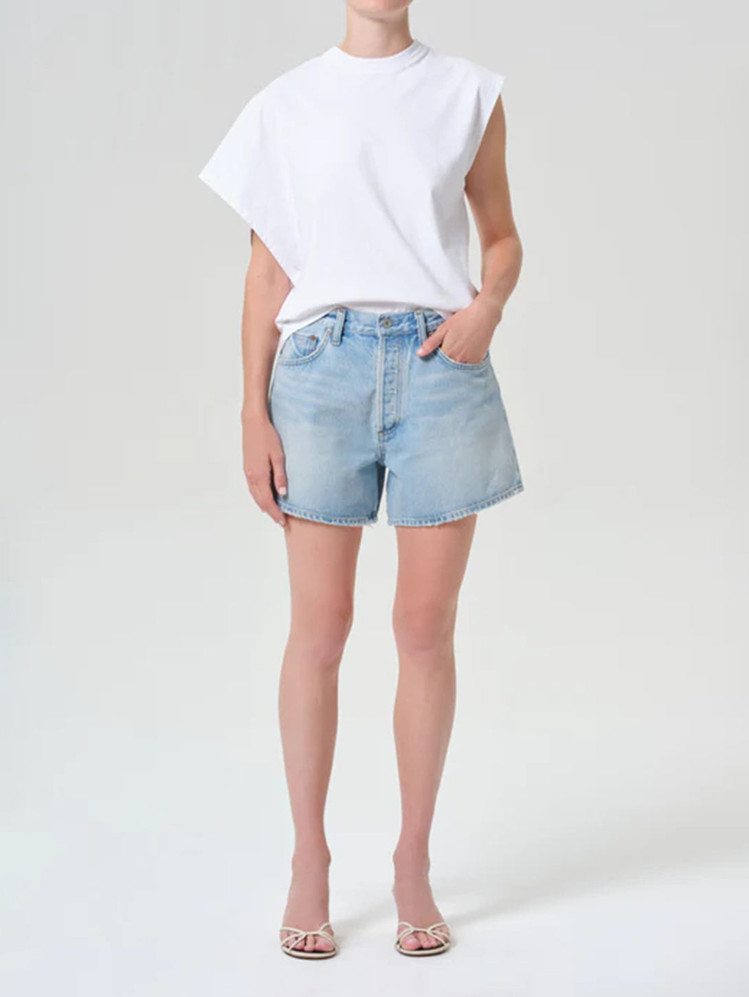 Inspired by the easy attitude of heritage denim, the Leith Vintage Short is designed with an oversized fit and a dropped rise for a relaxed, borrowed-from-the-boys feel. Crafted in a light dusty vintage indigo wash, it offers that perfectly worn-in look with a clean, considered finish. The silhouette is casual yet polished, featuring a clean hem that updates the classic vintage short with a fresh, modern edge. Made from rigid non stretch 100% regenerative cotton denim with a soft hand feel, it delivers all day comfort while maintaining its crisp structure. Effortlessly easy and endlessly versatile—style it low on the hips with a simple tank or pair with an oversized shirt for a laid-back, cool summer uniform.