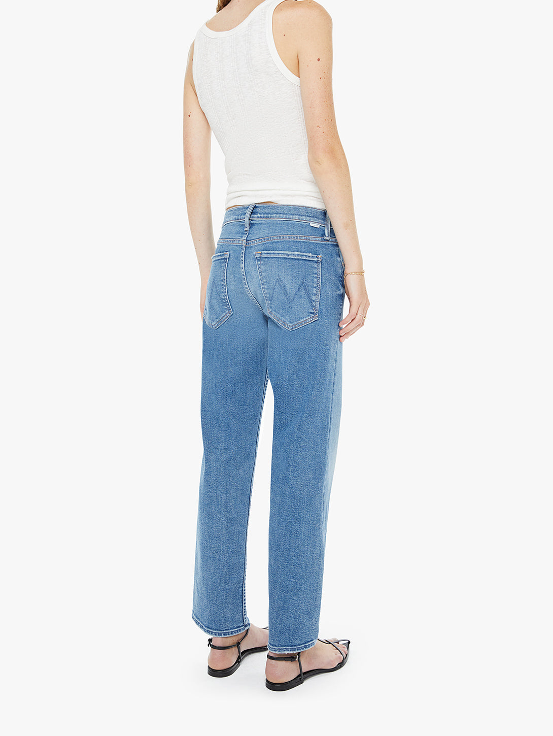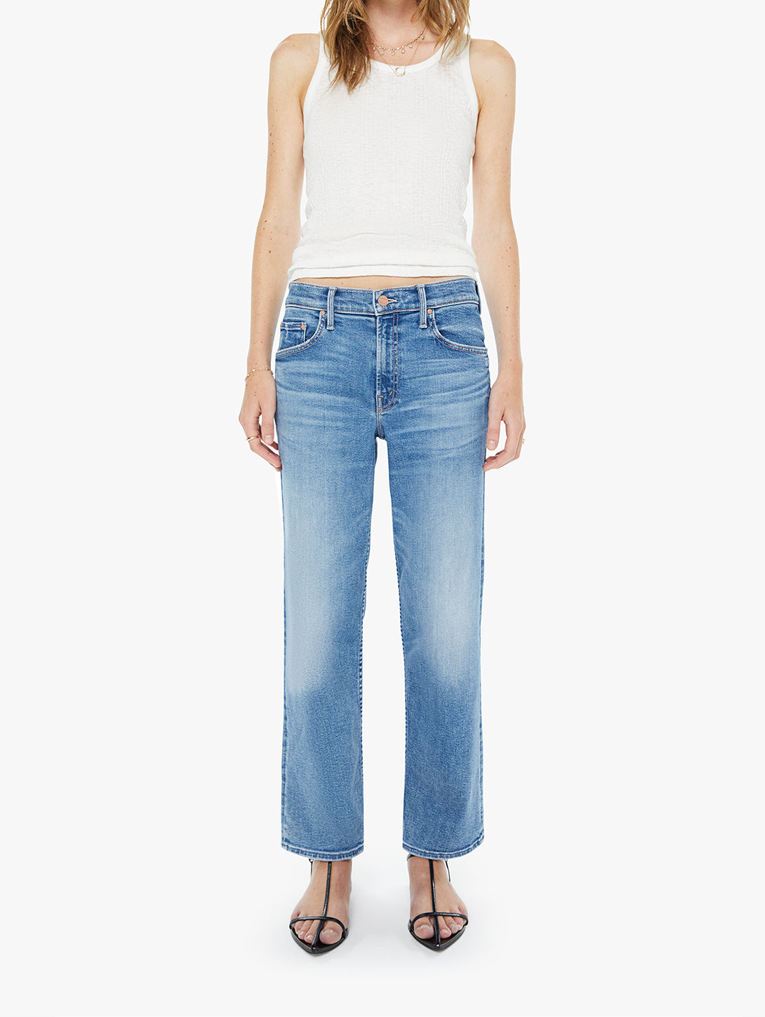 Smooth sailing. High-rise straight-leg jeans with a zip fly, ankle-length inseam and a clean hem. Made from stretch denim, Float My Boat is a light blue with whiskering and fading.