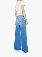 This iconic high-waisted wide leg has a 29-inch inseam and a frayed hem. Made from stretch denim, Fan Favourite is a mid-blue wash with subtle whiskering and fading at the knees."