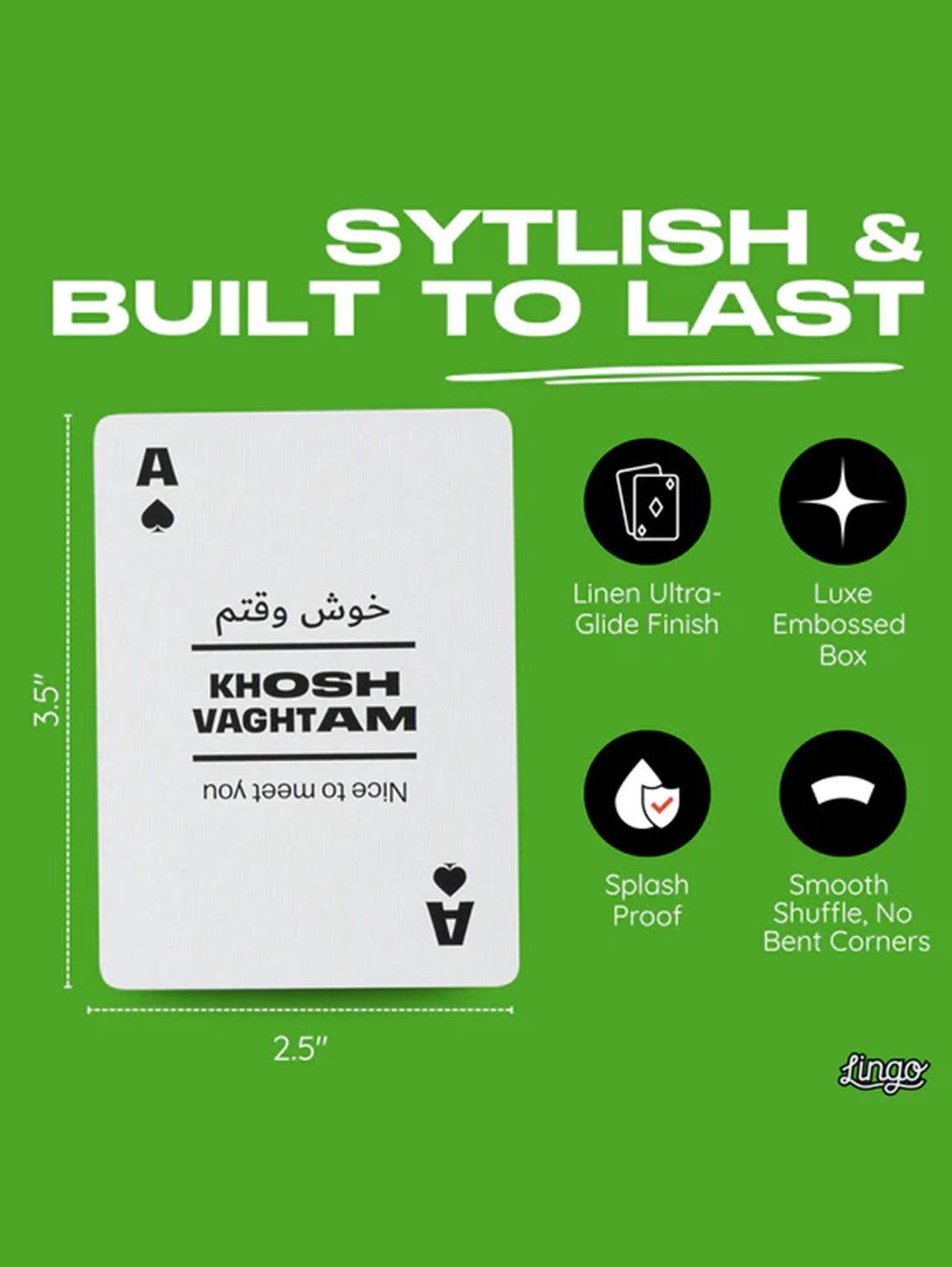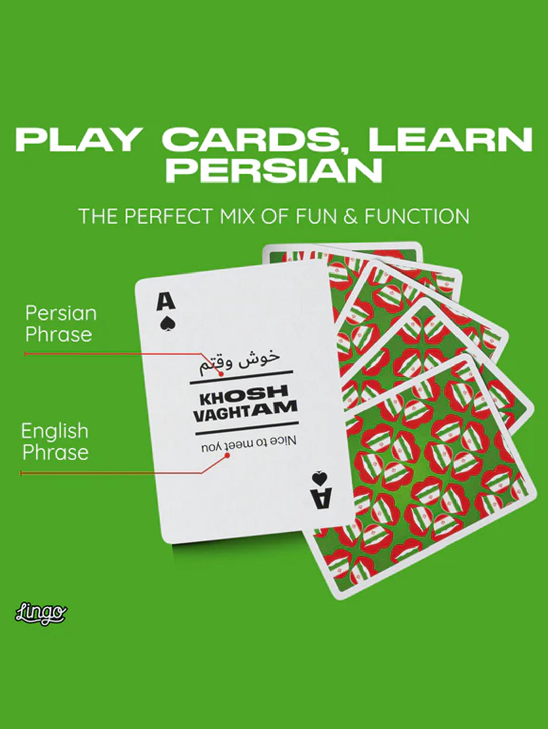 Experience the elegance of the Persian language with our Farsi Slang & Phrases edition — a celebration of poetry, hospitality, and centuries-old tradition. From heartfelt greetings like “Salam” (Hello) to expressions of appreciation like “Merci” (Thank you), this deck helps you speak with the warmth and charm that Persians are known for. Inspired by the bazaars of Tehran, the ancient ruins of Persepolis, and the flavours of saffron and pistachio, each card offers a window into Iran’s rich cultural heritage. Perfect for Persian families teaching the next generation, travellers exploring Iran, or anyone captivated by its music, literature, and legendary hospitality.}.