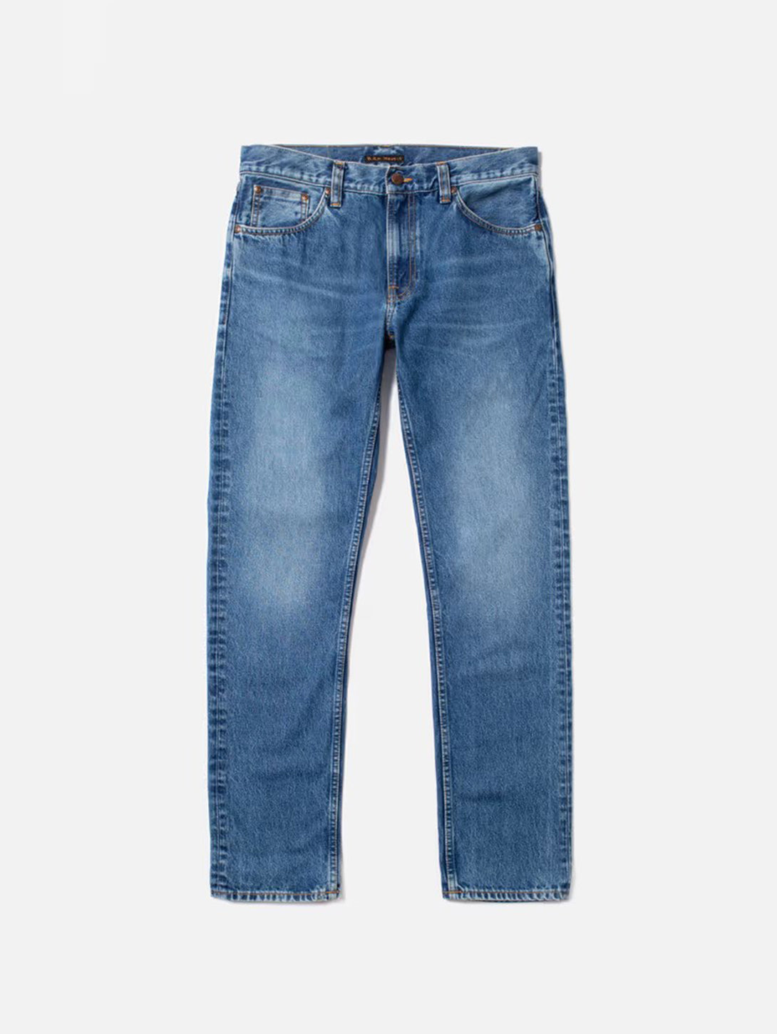 Regular fit jeans with a straight leg in a mid-blue wash with subtle contrasts. It is rustic yet refined with a captivating interplay of calm abraded areas and lively marble effects. The denim's appearance is simultaneously super clean, with brilliant blue hues that gently contrast the warm highlights. It's the perfect balance of blue hues and refined character that makes these jeans shine!
