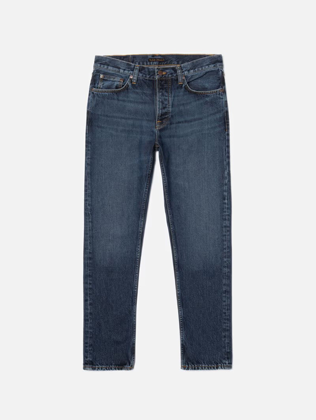 Regular-fit jeans with a tapered leg made in a dark blue wash with subtle wear. Although dark, these jeans got it all. They span an impressive array of indigo hues - from the darkest of the dark to muted bright blue highlights. Abraded areas add softness while the unabraded ones add a rugged marble texture.