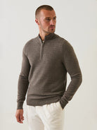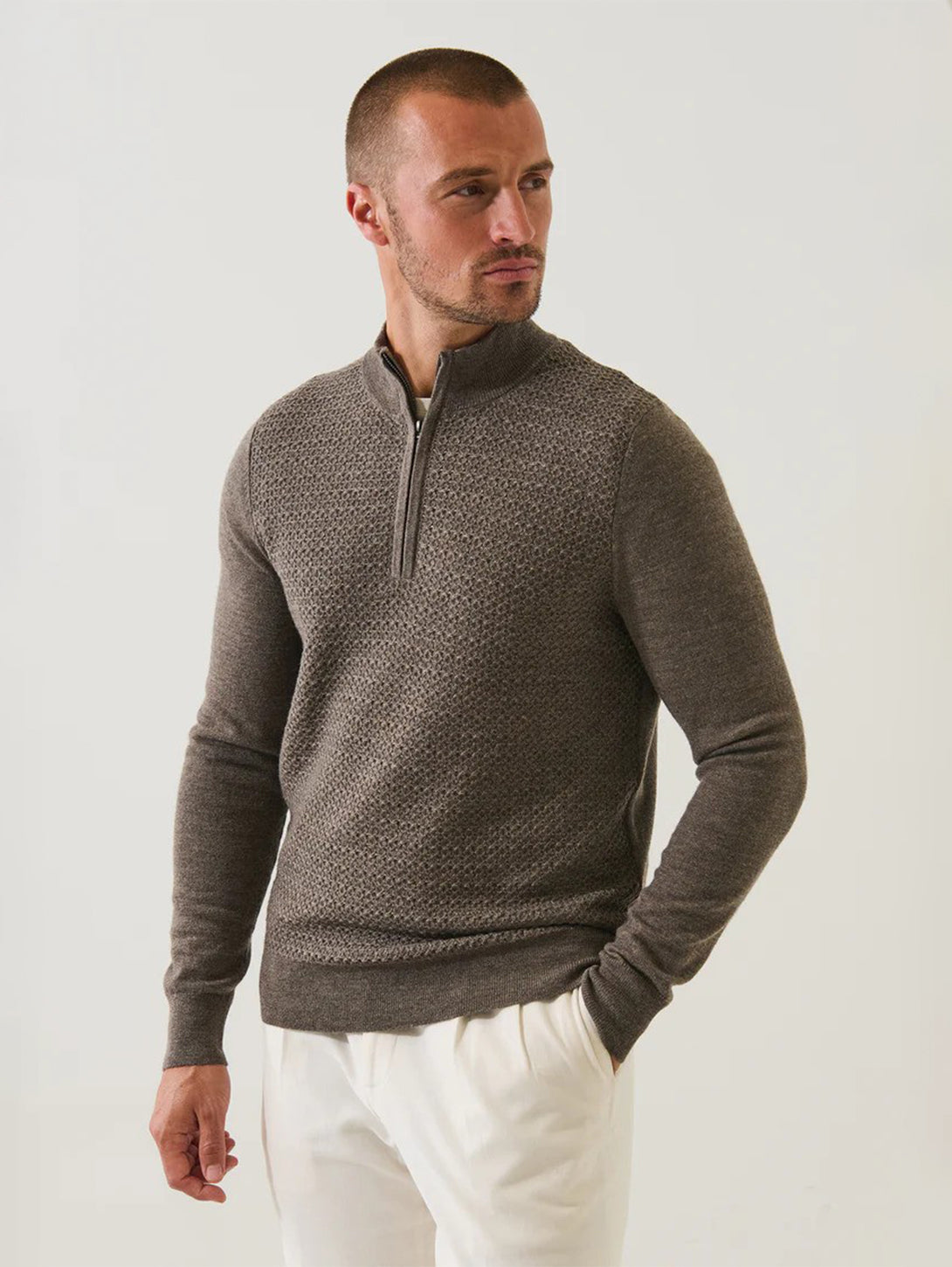 Discover the perfect blend of luxury and versatility with our Merino Textured Quarter Zip. Crafted from 100% extra fine merino wool, this elevated essential features a subtle honeycomb-textured front that brings depth and modern sophistication to the classic mock neck silhouette. A piece designed for both polished layering and standalone style.