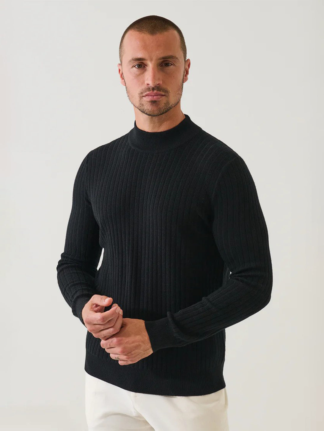 Refined yet versatile, this textured-stitch mock neck is crafted from 100% extra-fine merino wool for exceptional softness and warmth. The drop-needle vertical stripe design adds depth and dimension to a classic silhouette, creating a sophisticated layer for elevated cold-weather style.