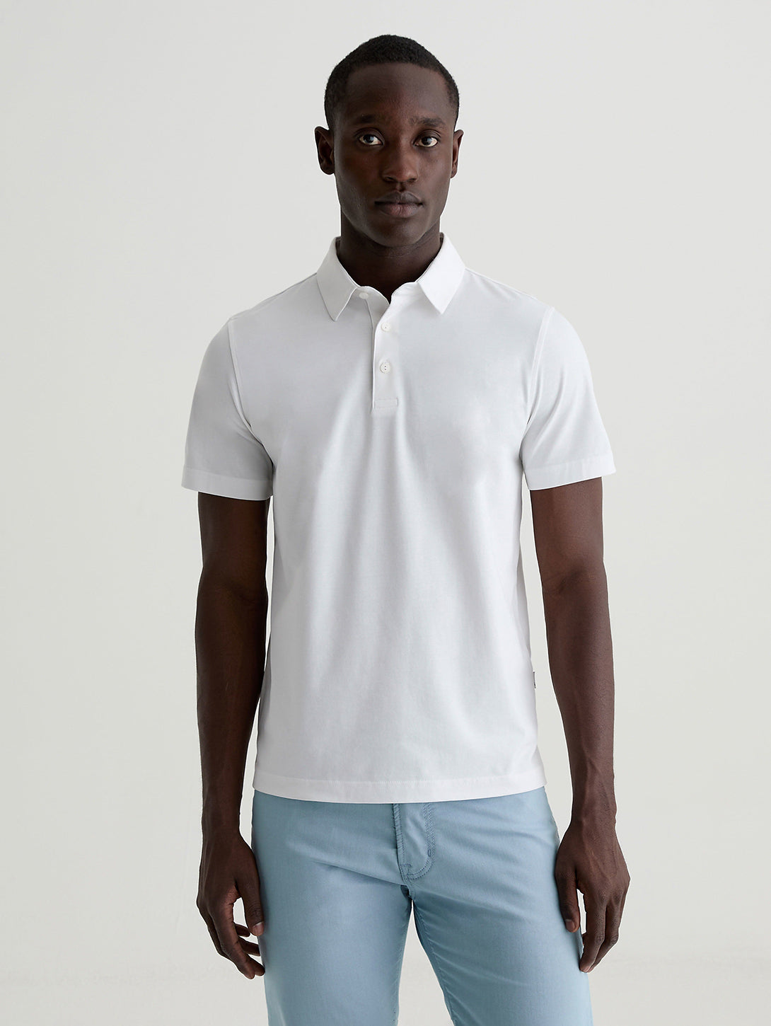Stay cool and comfortable in our Active Performance Bryce Polo Shirt, now available in True White. Designed with a classic fit and crafted from performance dry jersey, it combines the softness of cotton with moisture-wicking technology to keep you dry all day. Engineered to retain its sleek fit over time, it features a spread collar, button placket, and a silicone heat transfer logo on the left sleeve