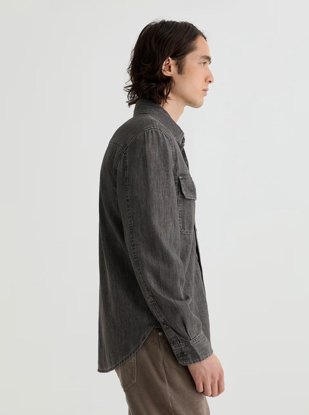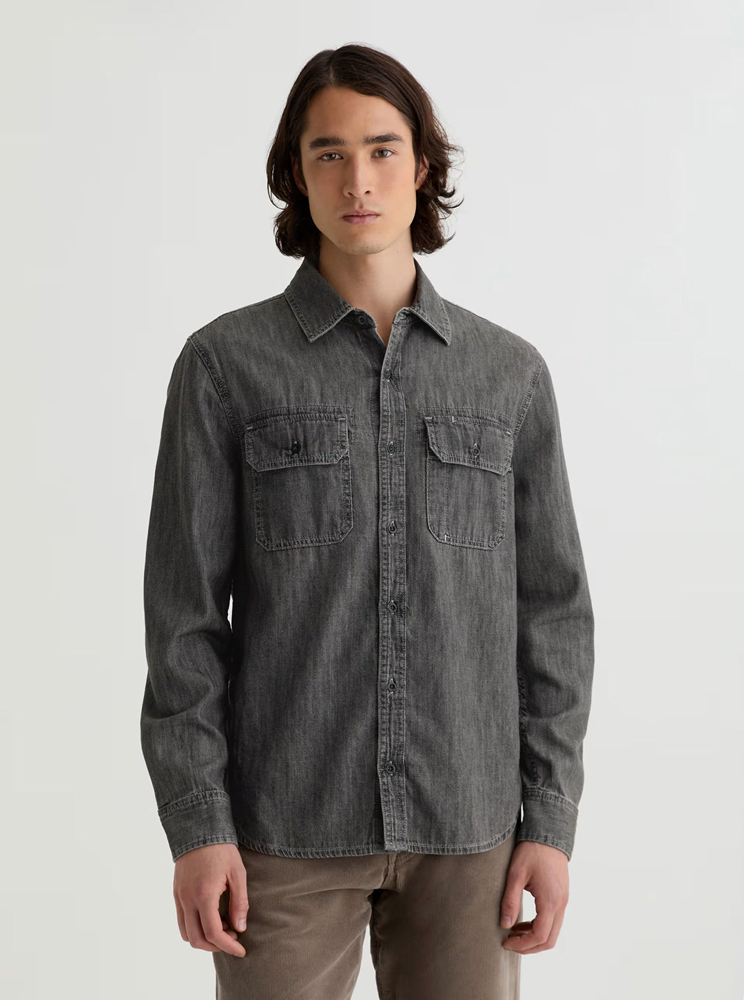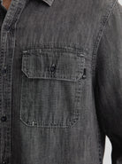 The Curtis Work Shirt is a long-sleeve button-up with a classic fit, crafted from non-stretch black denim. Designed for structure and durability, it features a true black interior and exterior for a clean, uniform look with timeless edge.