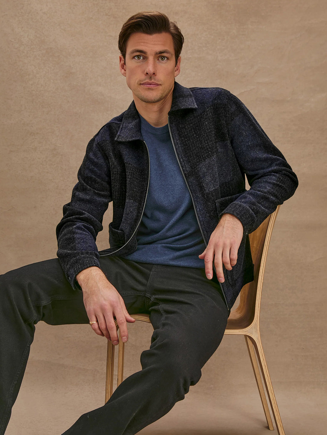 The Simon is a zip-up jacket crafted from a luxurious wool blend with a boucle texture. Details include patch pockets and a patchwork-inspired finish.