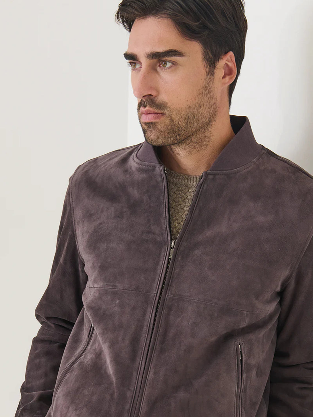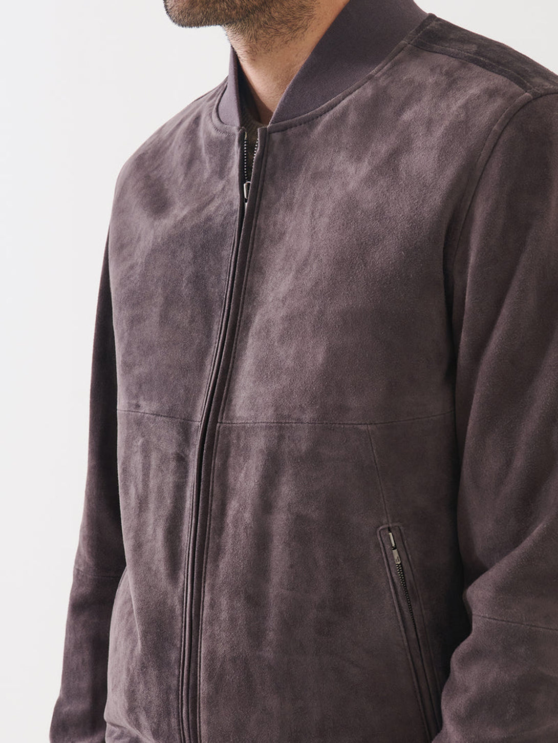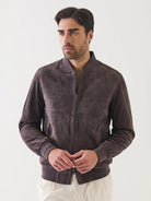 Elevate your outerwear collection with this luxurious baseball bomber jacket crafted from premium suede. Featuring a smooth full-zip front and classic bomber silhouette, this jacket combines sporty inspiration with refined craftsmanship for a versatile, timeless piece. This suede offers rich texture and warmth, while the ribbed collar, cuffs, and hem ensure a comfortable fit. Perfect for layering, it adds a sophisticated edge.