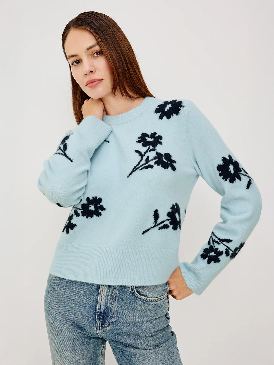 The Anise sweater exudes feminine charm with vintage-inspired contrast floral motifs. Knitted from a cozy wool blend, it features a classic crew neckline, long sleeves, and a relaxed, boxy fit.