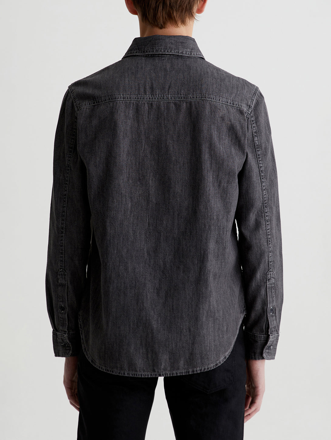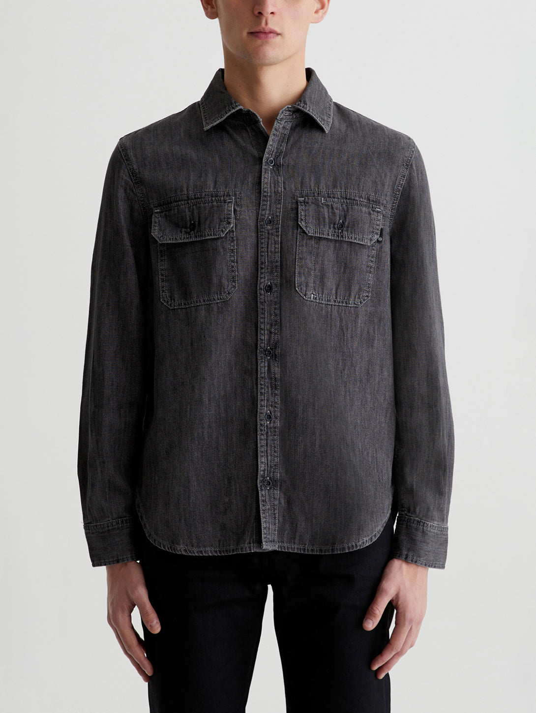 The Curtis Work Shirt is a long-sleeve button-up with a classic fit, crafted from non-stretch black denim. Designed for structure and durability, it features a true black interior and exterior for a clean, uniform look with timeless edge.