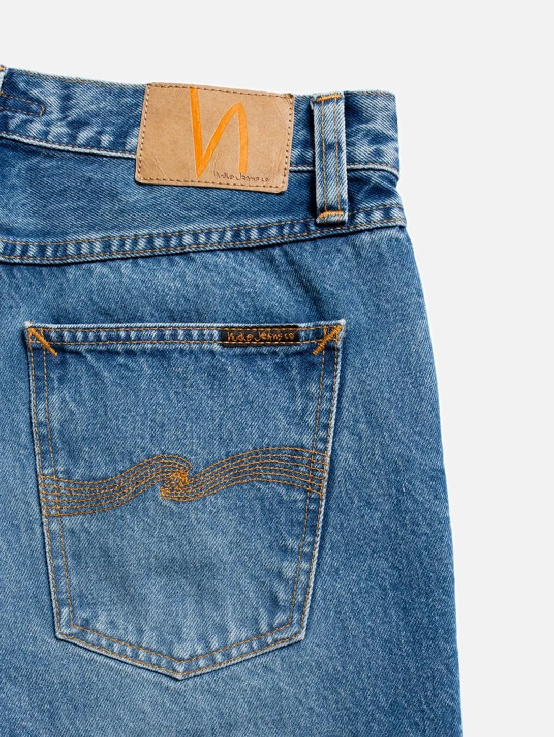 Regular fit jeans with a straight leg in a mid-blue wash with subtle contrasts. It is rustic yet refined with a captivating interplay of calm abraded areas and lively marble effects. The denim's appearance is simultaneously super clean, with brilliant blue hues that gently contrast the warm highlights. It's the perfect balance of blue hues and refined character that makes these jeans shine!