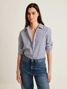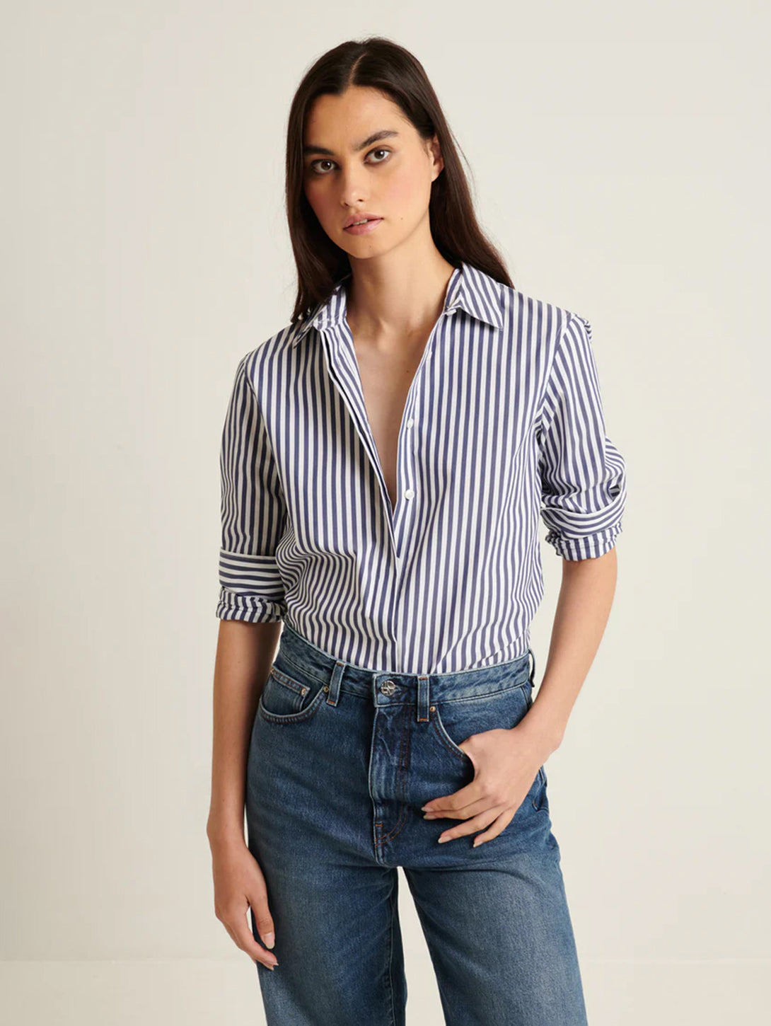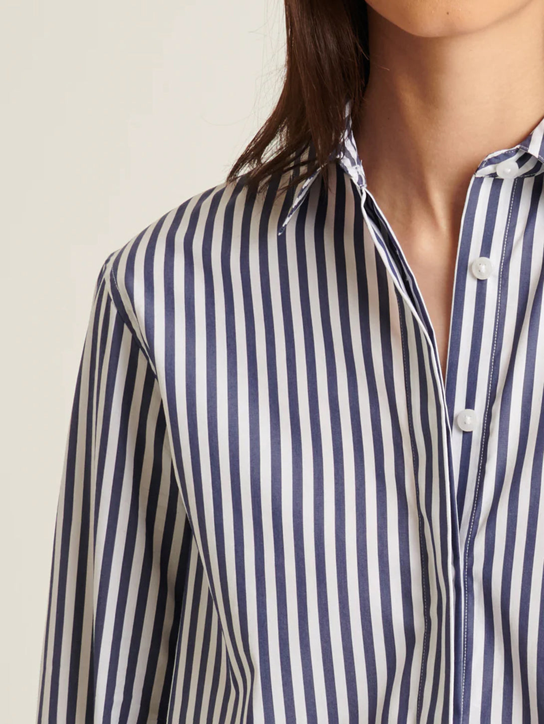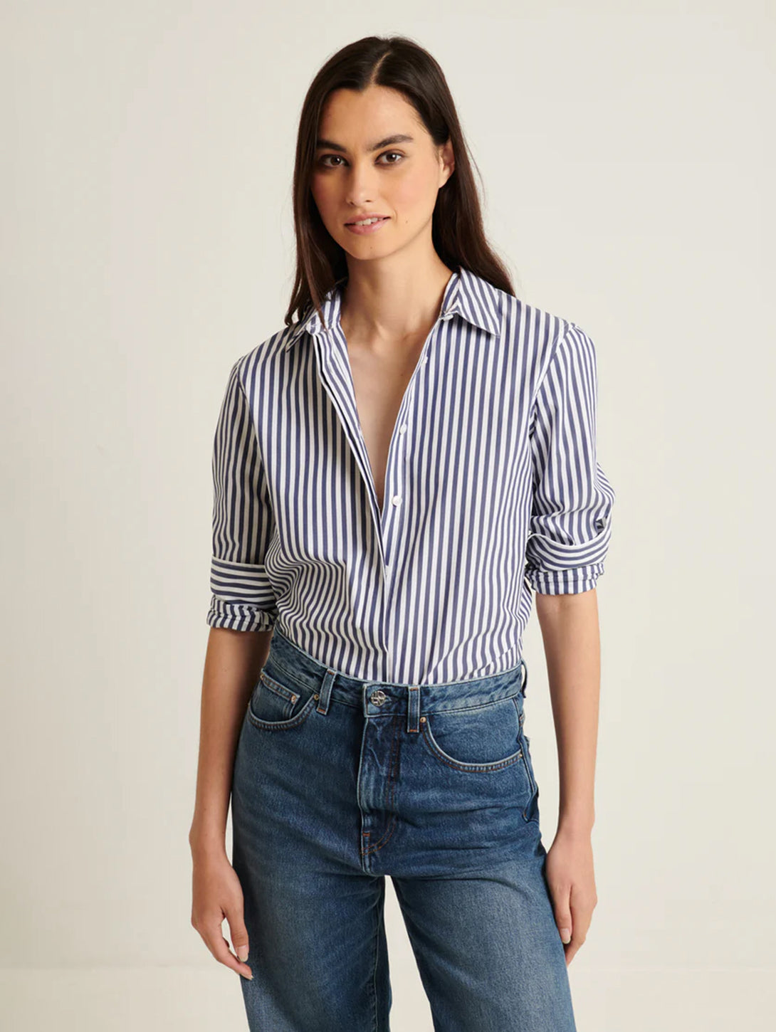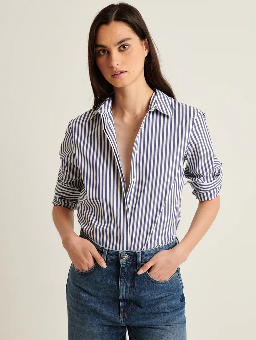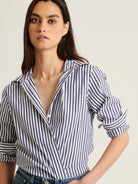 Our relaxed stripe shirt is crafted from a high-quality cotton stretch and is a timeless wardrobe staple. Offered in bold seasonal stripes, this effortless silhouette is the perfect piece to wear with your favourite Spring trouser.