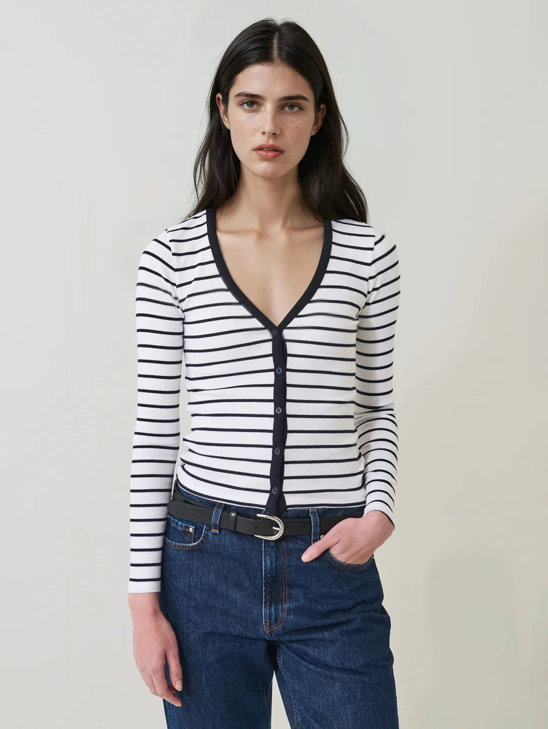 Patrick Assaraf's cardigan is cut from our ultra soft cotton modal fabric. This style is designed for a slim fit and features a sophisticated midnight navy stripe throughout. This piece is the perfect complement to your favourite Spring denim.