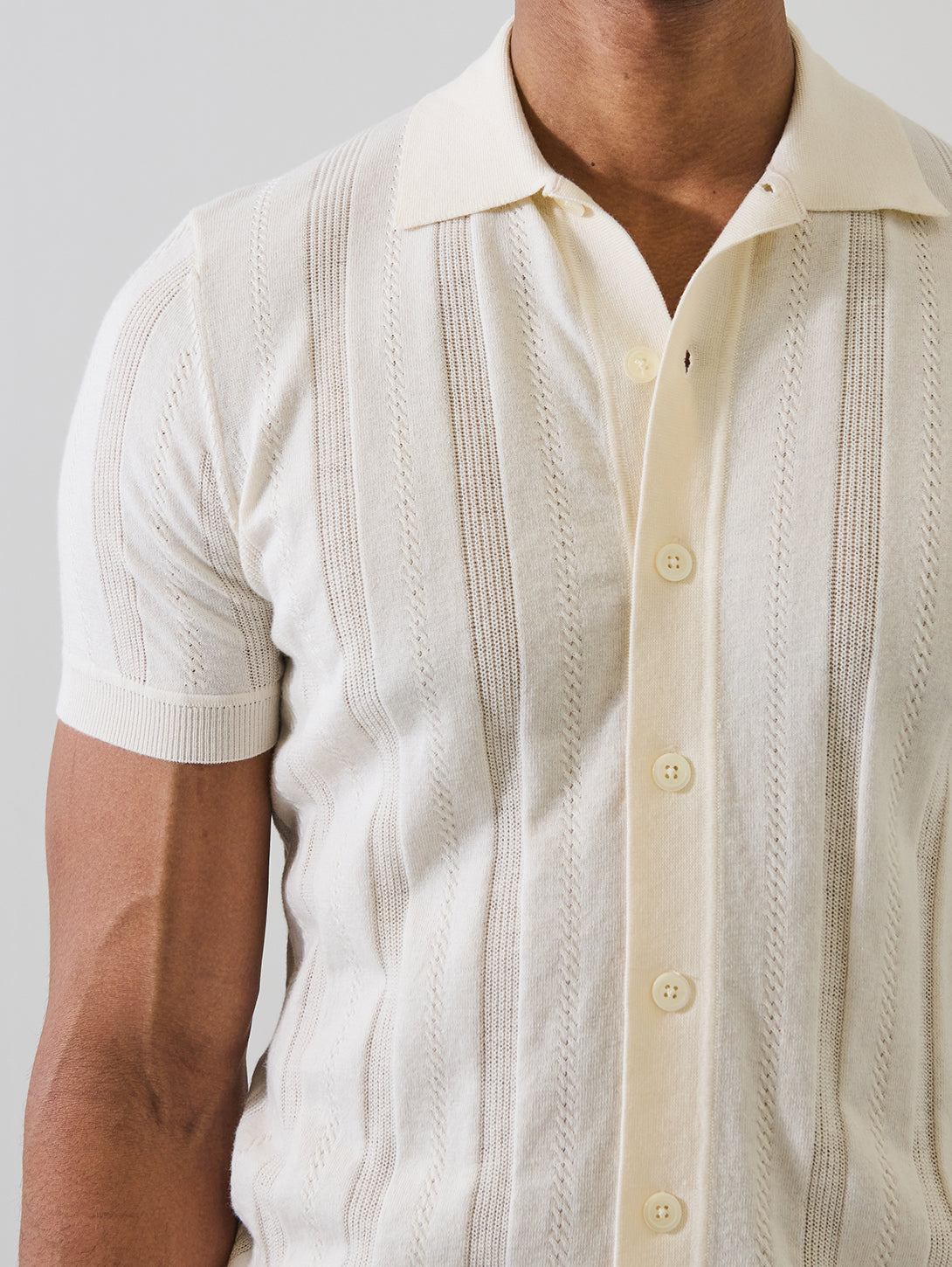 This drop-needle, tonally striped button-up knitted shirt channels a refined 1950s resort and lounge aesthetic, delivering a polished yet subtly nostalgic appeal. The textured stripe effect adds depth and visual interest, while maintaining a sophisticated, understated look. Knitted from a luxuriously soft cotton–cashmere blend yarn, it offers exceptional comfort and lightweight warmth. Designed with a more defined silhouette, it creates a sharp, tailored profile that feels both vintage-inspired and distinctly modern.