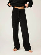 • Women’s chenille cable knit lounge pant in black with drawstring waist and open-leg silhouette.
