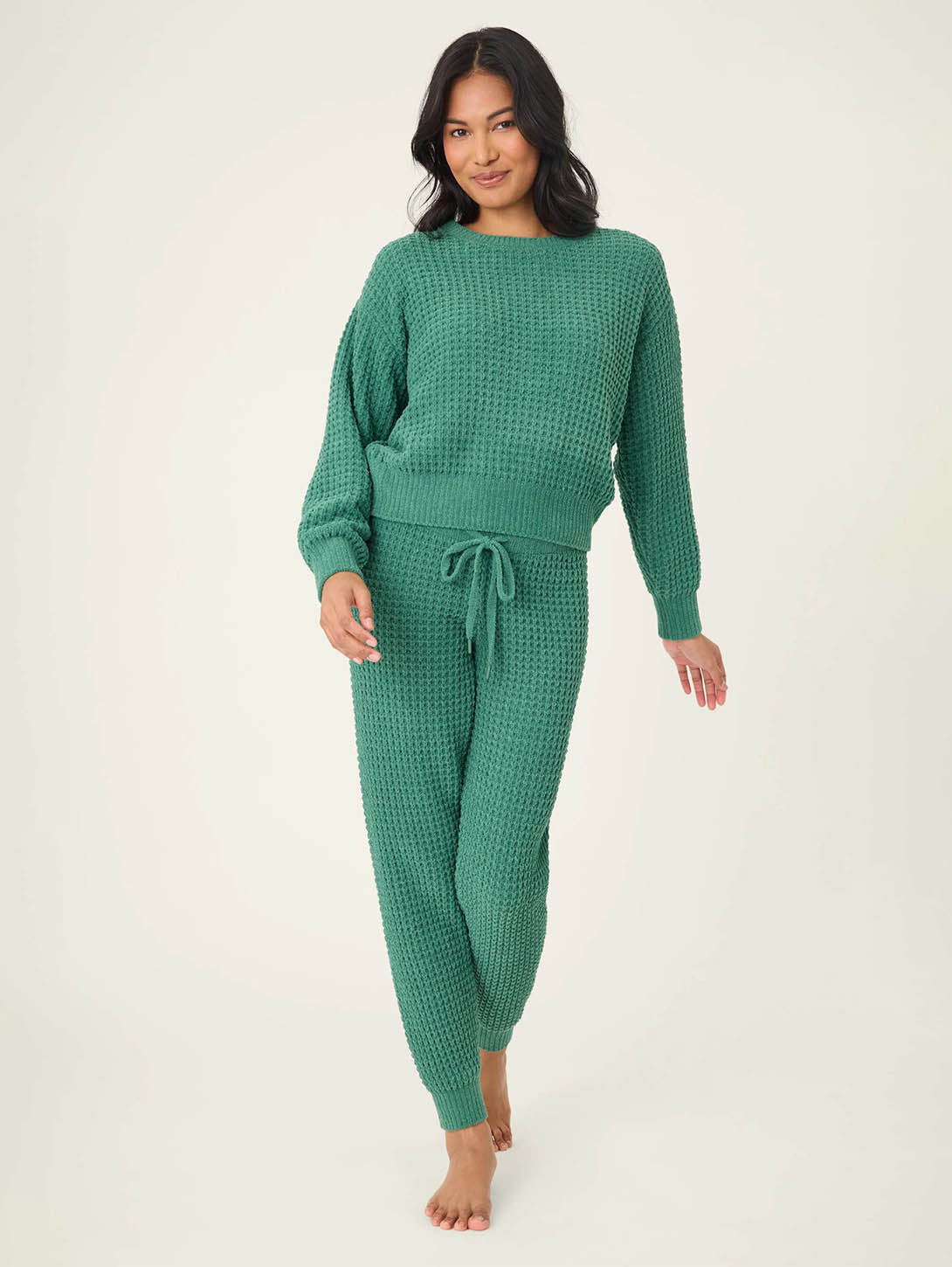- Women’s green pajama set in chenille waffle knit with relaxed crewneck top, cuffed trim, and jogger pants with drawstring waist and cuffed ankles.