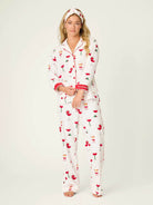 Raise a glass to cozy season in this ivory cotton flannel pajama set, patterned with festive wine glasses topped with poinsettias, bows, and sprigs of holly. This plus-size three-piece design includes a button-down top finished with red piping, relaxed drawstring pants, and a matching headband—perfect for holiday happy hours, wrapping marathons, and fireside lounging.