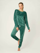 - Women’s dark green pajama set in silky velour with allover white dot print, long sleeve henley top with button placket and banded cuffs, and drawstring jogger-style pants with cuffed hems.