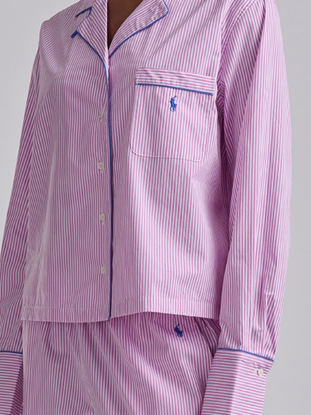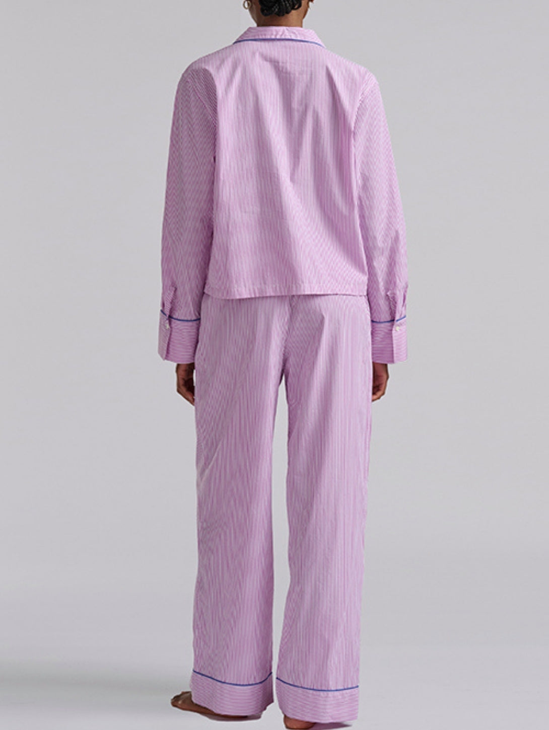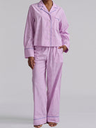 A timeless pajama essential with a tailored finish, the Core 23" PJ Set with Piping delivers classic sleepwear style in a fresh seasonal stripe. The button-front long-sleeve top is accented with contrast piping for a polished look, while the matching straight-leg pant features a comfortable elastic waistband. Designed for both sleep and lounging, this set blends structure and softness in an effortlessly refined silhouette.