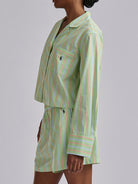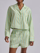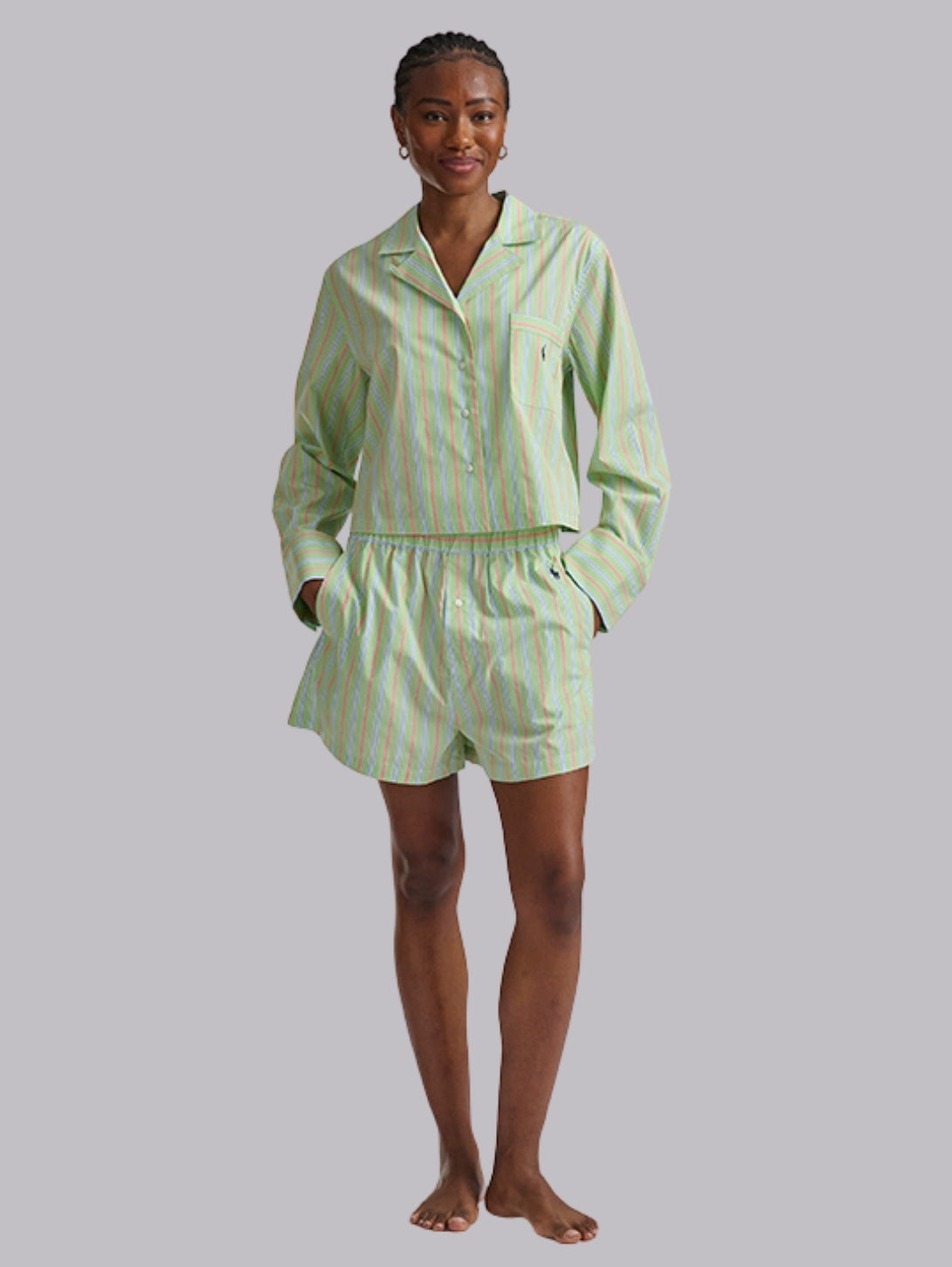 A fresh, modern take on classic striped sleepwear, the Crop/Boxer PJ Set pairs a cropped button-front top with easy pull-on boxer shorts for an effortless silhouette. Designed in a soft, lightweight fabric with subtle striping, this set balances relaxed comfort with a polished, menswear-inspired feel—perfect for sleeping, lounging, or slow mornings at home.