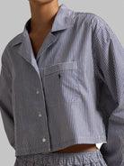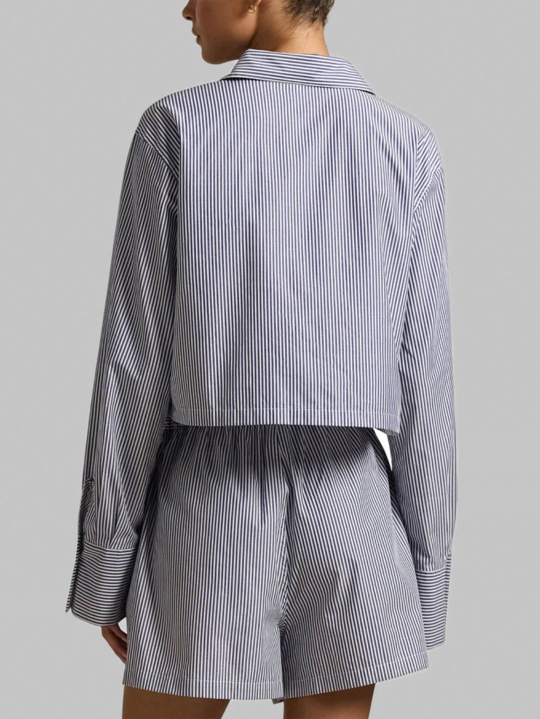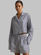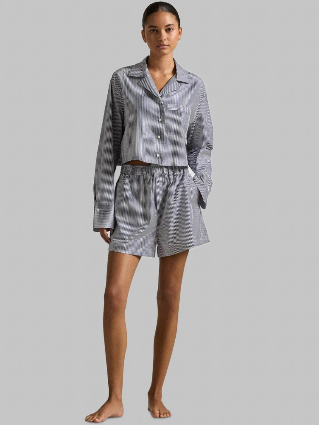 A fresh, modern take on classic striped sleepwear, the Crop/Boxer PJ Set pairs a cropped button-front top with easy pull-on boxer shorts for an effortless silhouette. Designed in a soft, lightweight fabric with subtle striping, this set balances relaxed comfort with a polished, menswear-inspired feel—perfect for sleeping, lounging, or slow mornings at home.