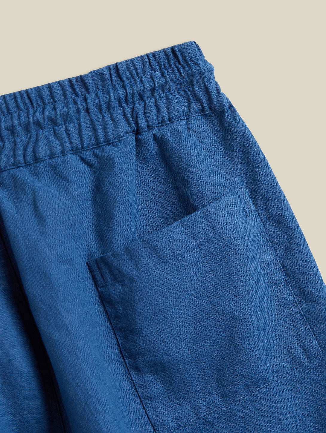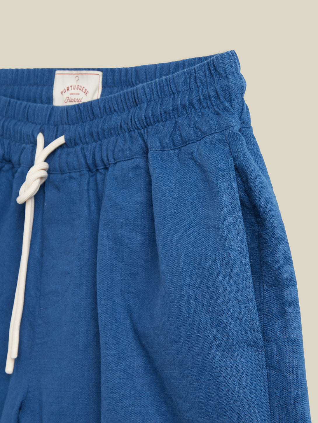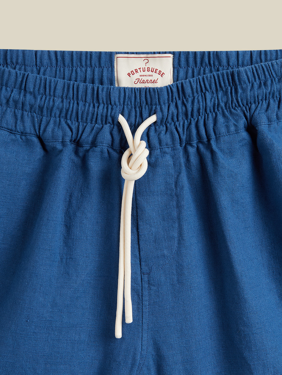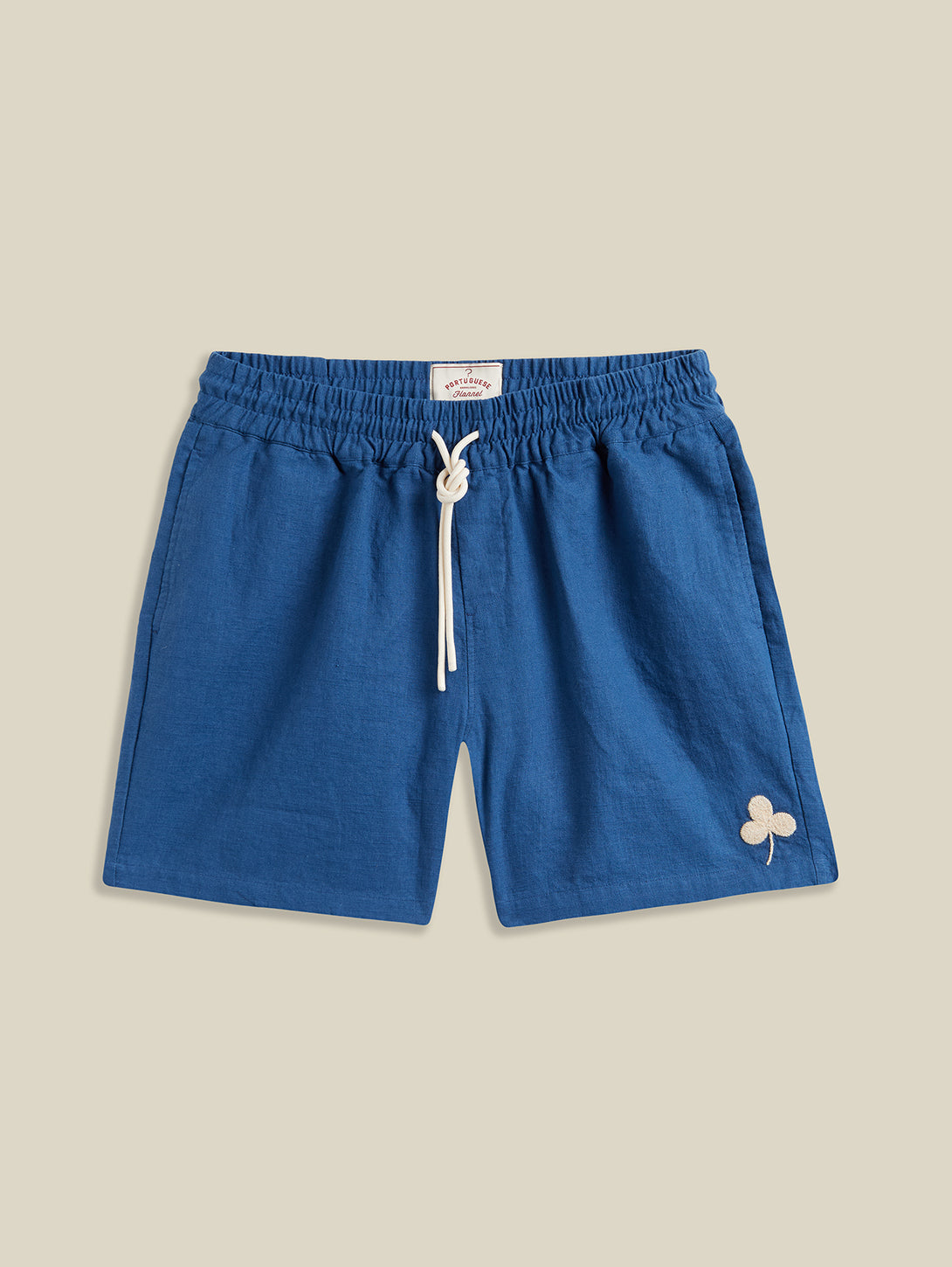 Tailored shorts for the modern man, crafted from breathable ramie fabric with refined embroidered detailing. Perfect for warm weather occasions, these blue shorts combine natural comfort with understated elegance, offering versatile style for casual outings or relaxed gatherings.