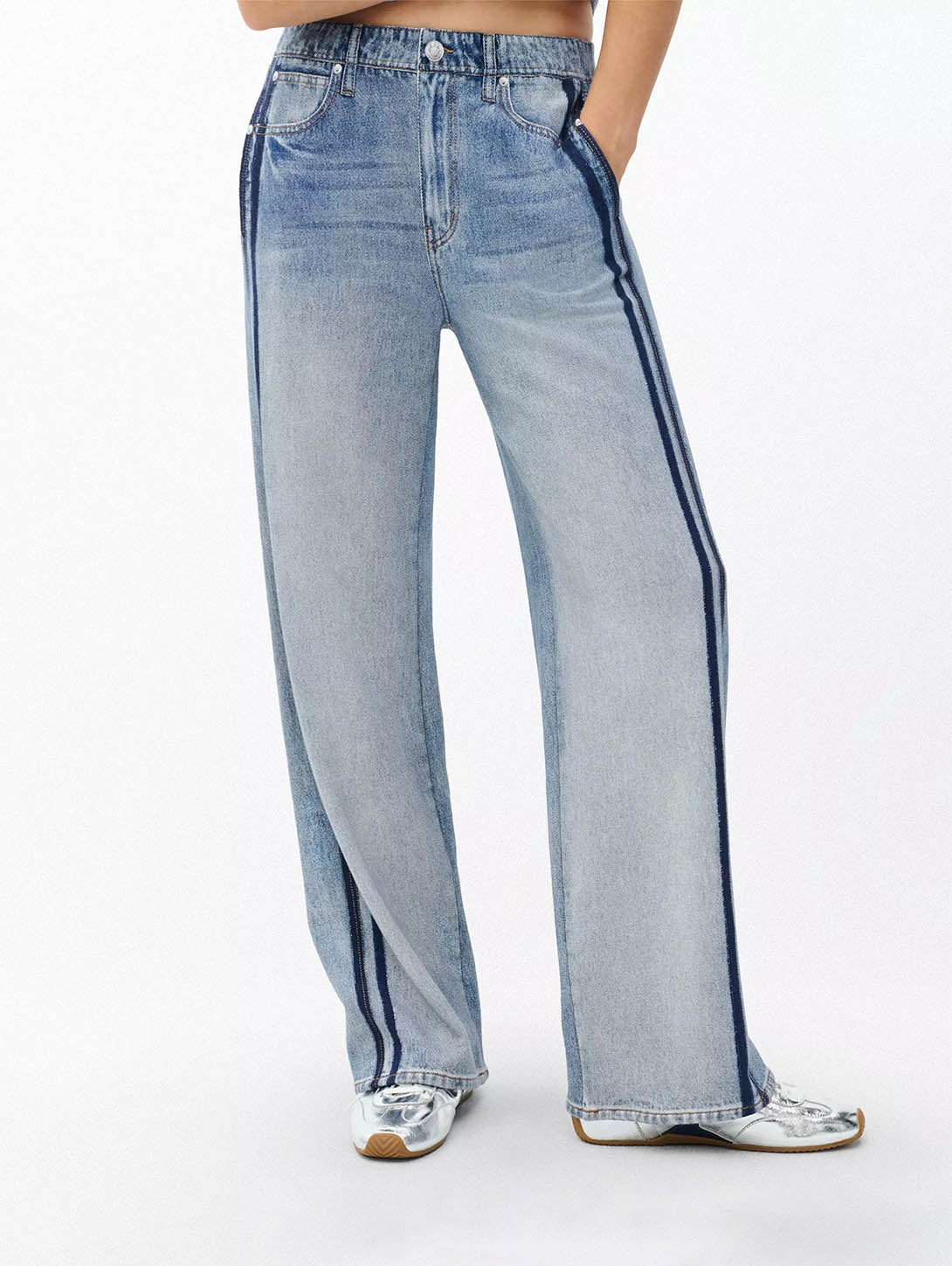 Miramar, our revolutionary printing technique, makes any material look like denim. These wide-leg track pants are cut and sewn from cotton terry cloth that's ultra-soft on the inside and printed on the outside to look like your favorite jeans. Featuring a pull-on elastic waistband and hidden side-seam pockets, the mid-rise style further achieves its comfortable fit and feel with its sporty side stripes, other pockets, and denim details digitally printed on the fabric.