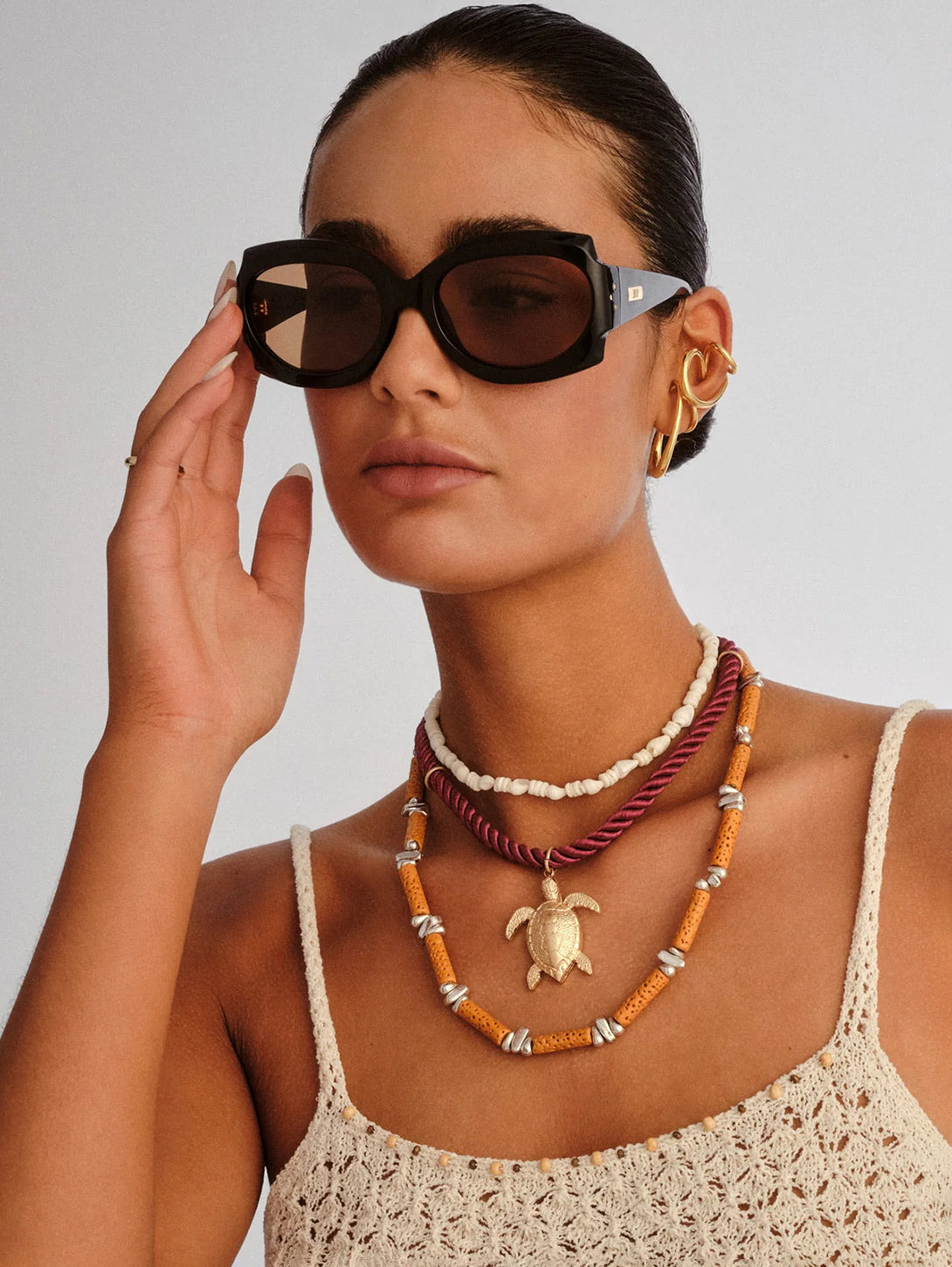 A bold ode to vintage resort styling, LOVELINESS channels timeless glamour through its oversized round silhouette and three-dimensionally sculpted frame. Featuring a softly curved front with subtle bevelled detailing and wide temples, this style is finished with signature Le Specs rectangle plate hardware at the temples and custom tri-rivet detailing.