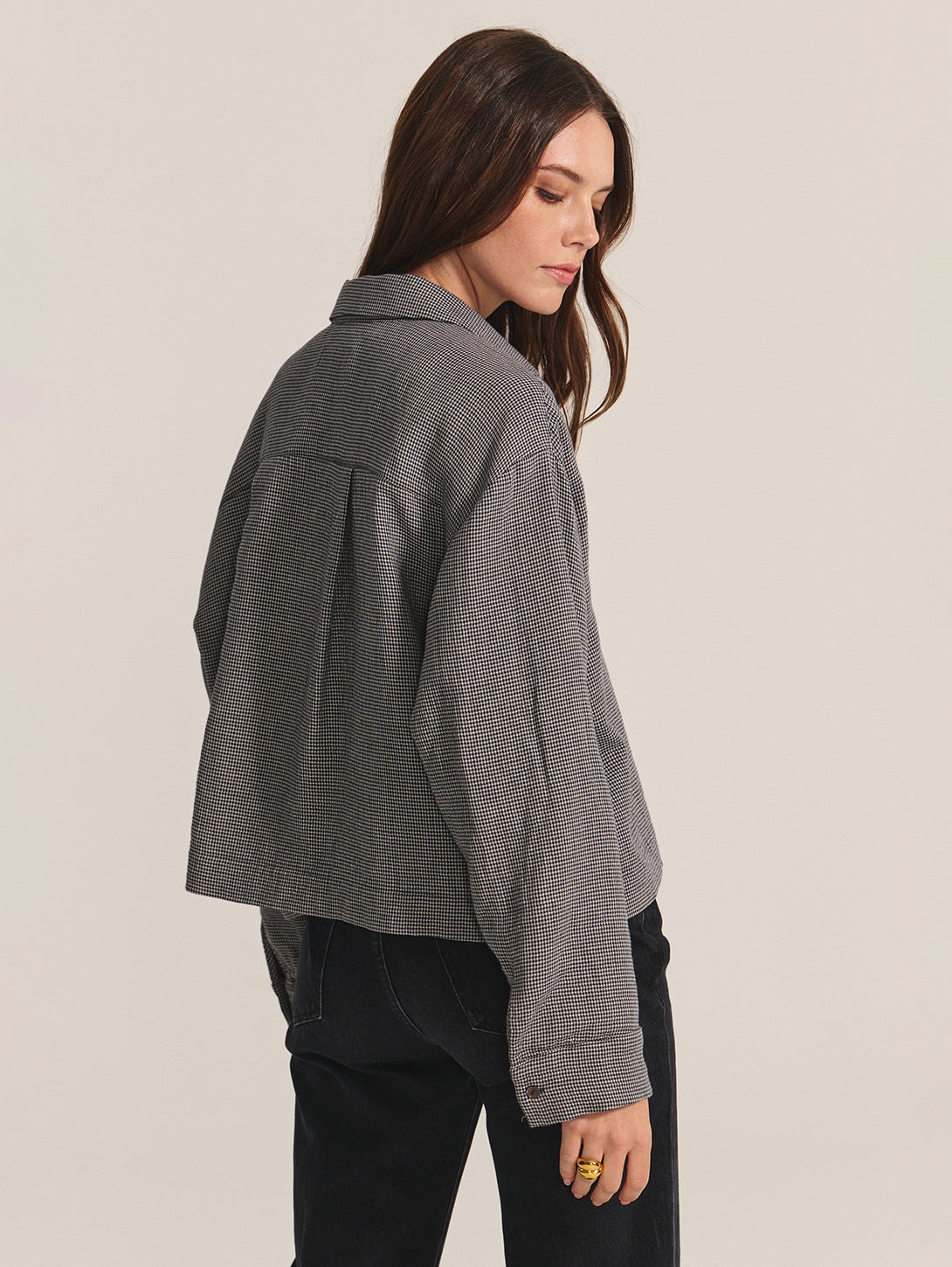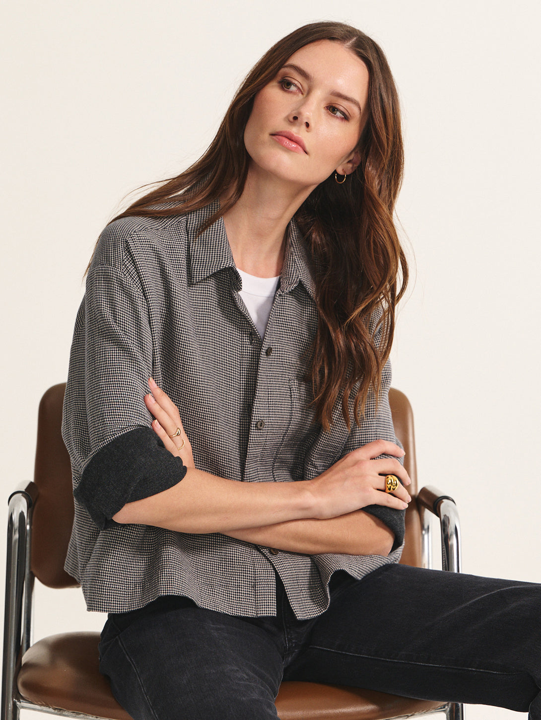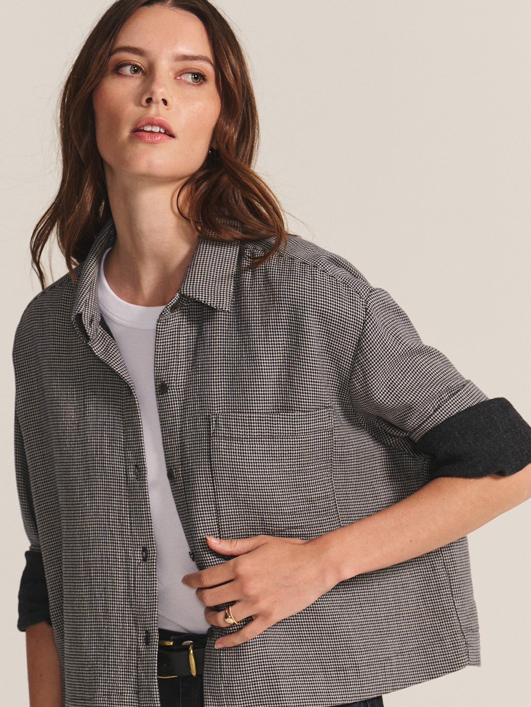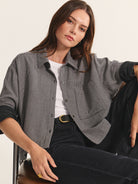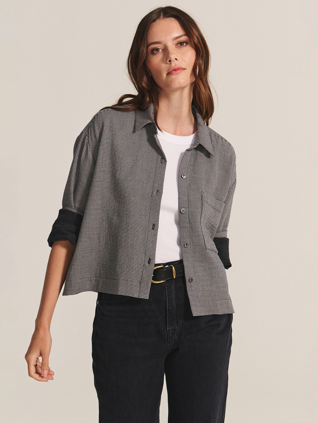 With a modern houndstooth detailing, this lined shirt brings a refined twist to a timeless silhouette. Designed in soft cotton gauze with a classic collar, 5-button front, and single chest pocket, its boxy, slightly cropped fit and rollable cuffs make it an easy choice for laid-back yet polished dressing. Complete the look with the Braylen Pant for a sophisticated, coordinated set.