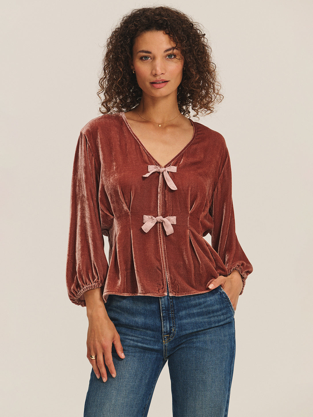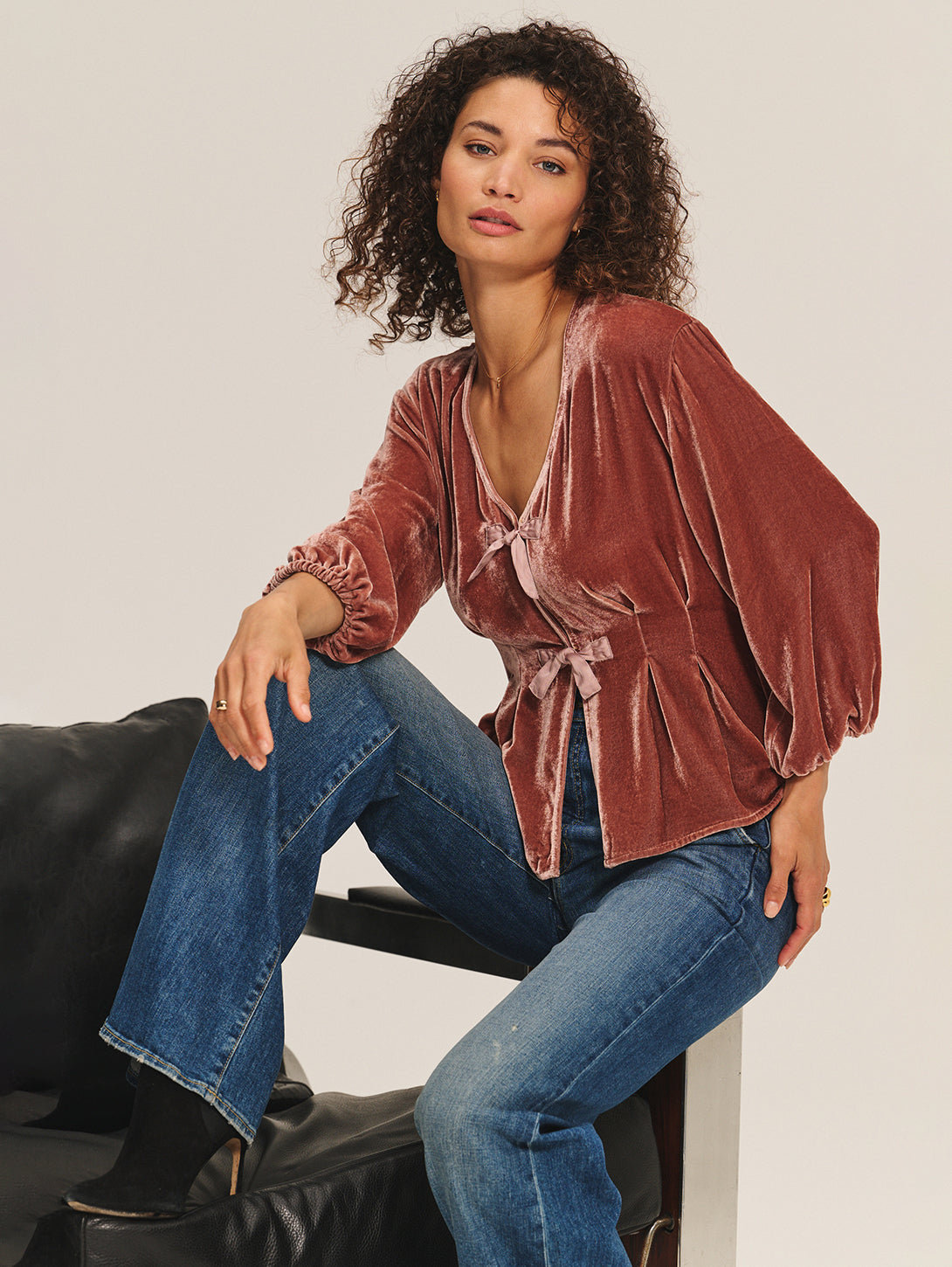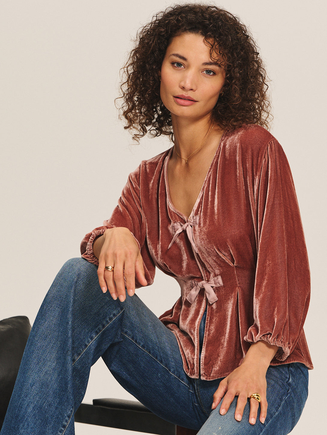 With two satin decorative ties at the front, this top offers a chic, eye-catching detail crafted in luxurious silk velvet. Pleated detailing on the front and back with elastic cuffs creates a flattering, feminine silhouette, making it the perfect piece to elevate any holiday look.