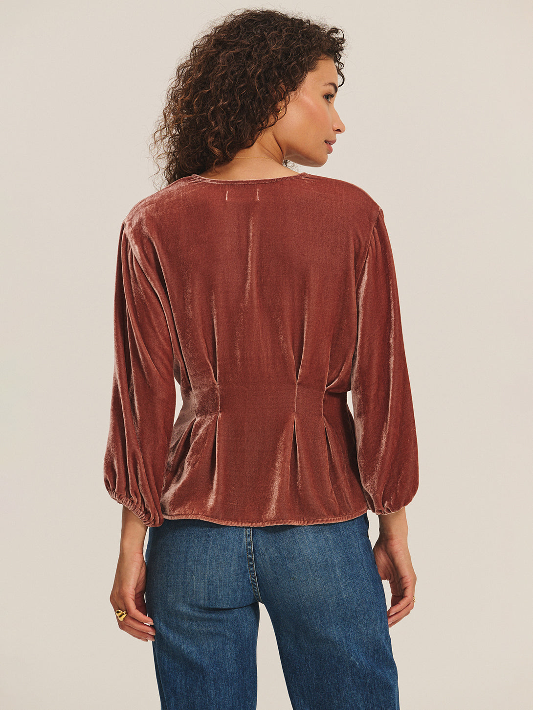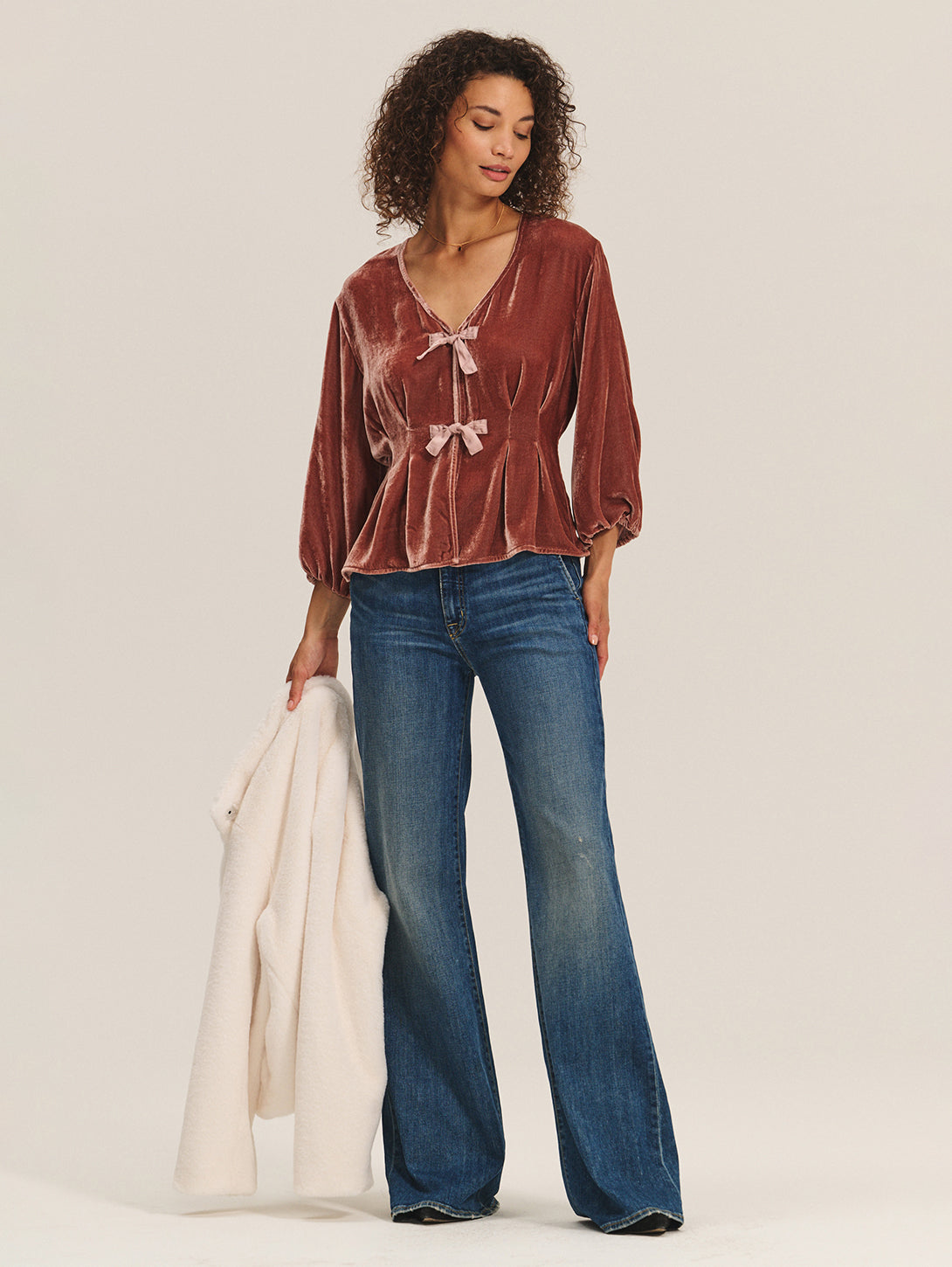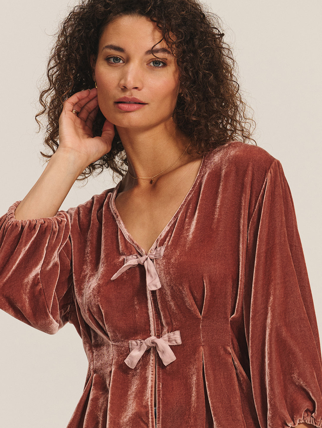 With two satin decorative ties at the front, this top offers a chic, eye-catching detail crafted in luxurious silk velvet. Pleated detailing on the front and back with elastic cuffs creates a flattering, feminine silhouette, making it the perfect piece to elevate any holiday look.