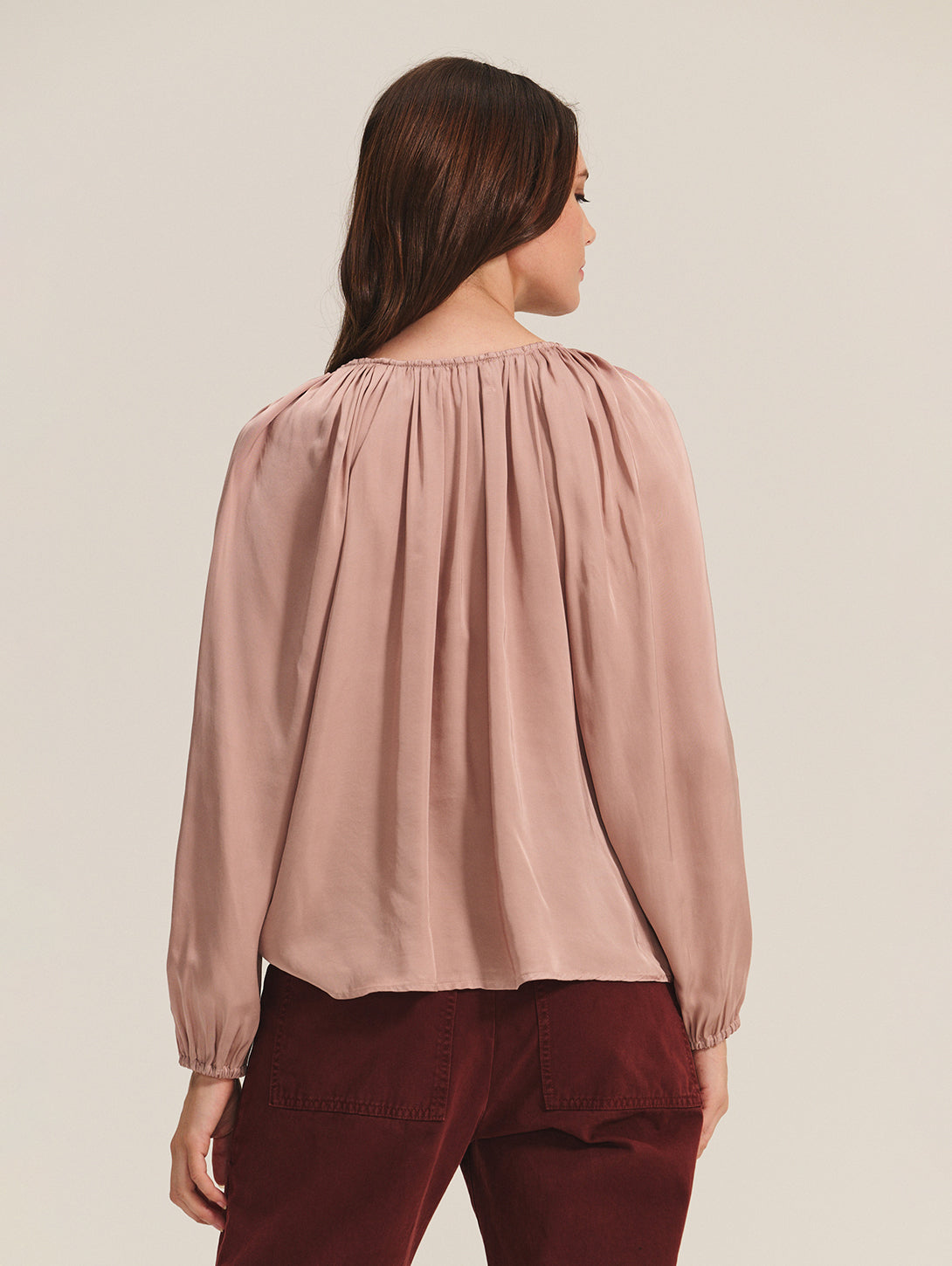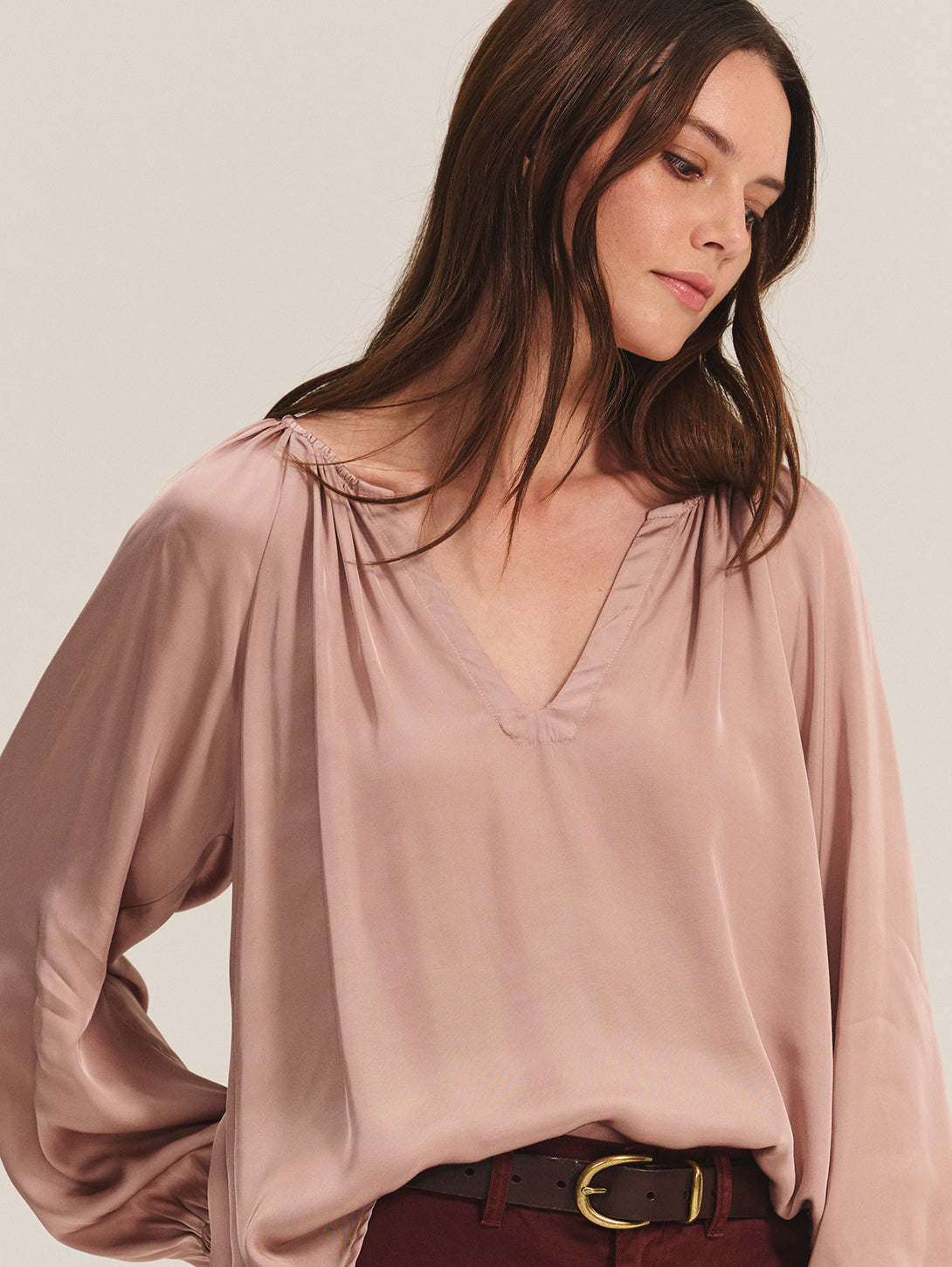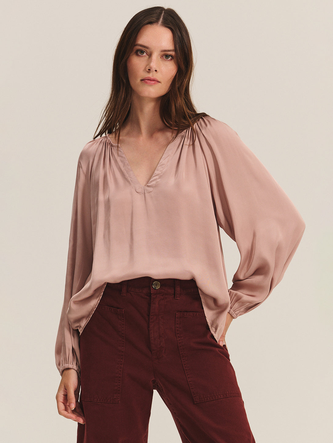 Elegant and lightweight, this satin top features a flattering V-neckline with subtle pleated detailing at the chest and back for added dimension. Offering a refined drape and soft sheen, this stunning piece is an easy choice for both dressy and casual looks. Pairs beautifully with the Larkin Pant.