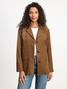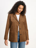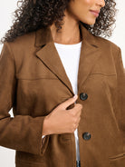 A sleek retro-inspired jacket in supple faux suede. This versatile outerwear piece features tonal stitching and a flattering structured shape.