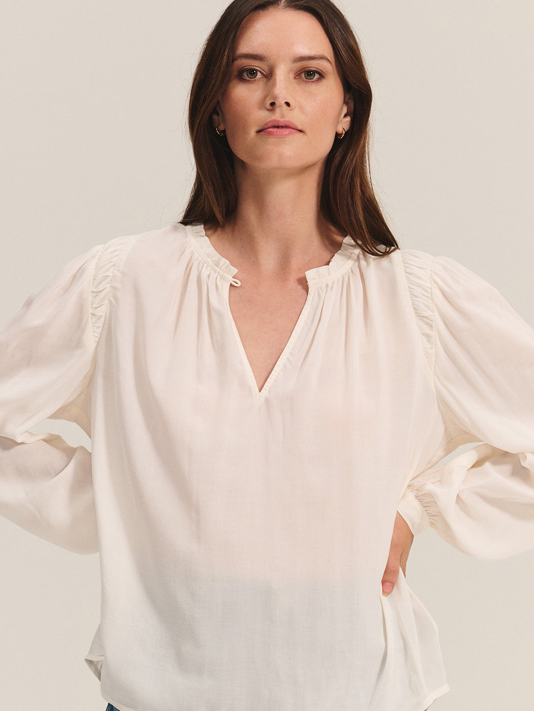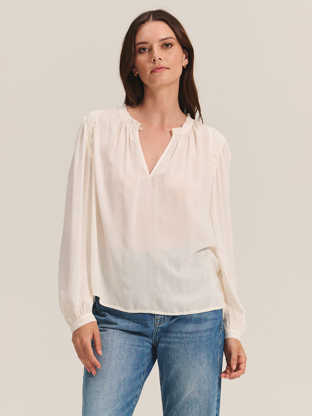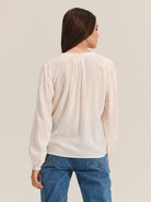 Soft and light in breathable rayon challis, this top features long sleeves with single button cuffs and a key-hole placket. Smocked detailing around the neck adds subtle texture.