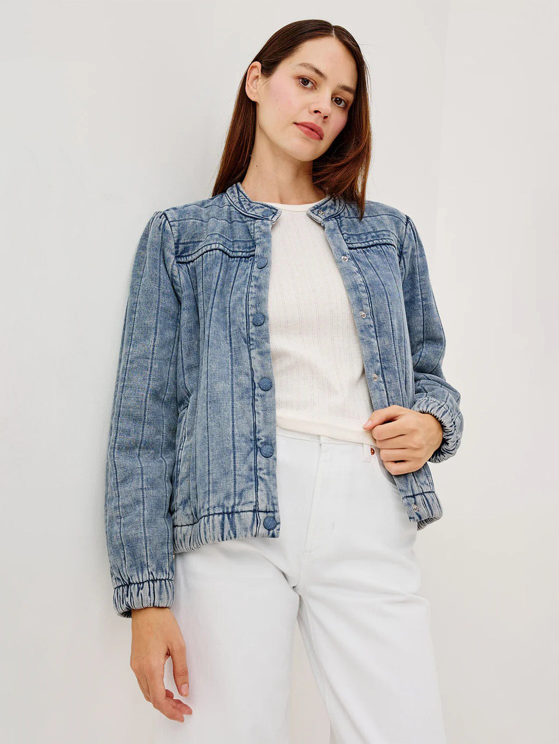 Denim appeal, cloud-like comfort. The Rosell is a boxy bomber jacket in ultra-soft quilted washed denim with snap button closures, elastic cuffs and hem, and long puff sleeves.