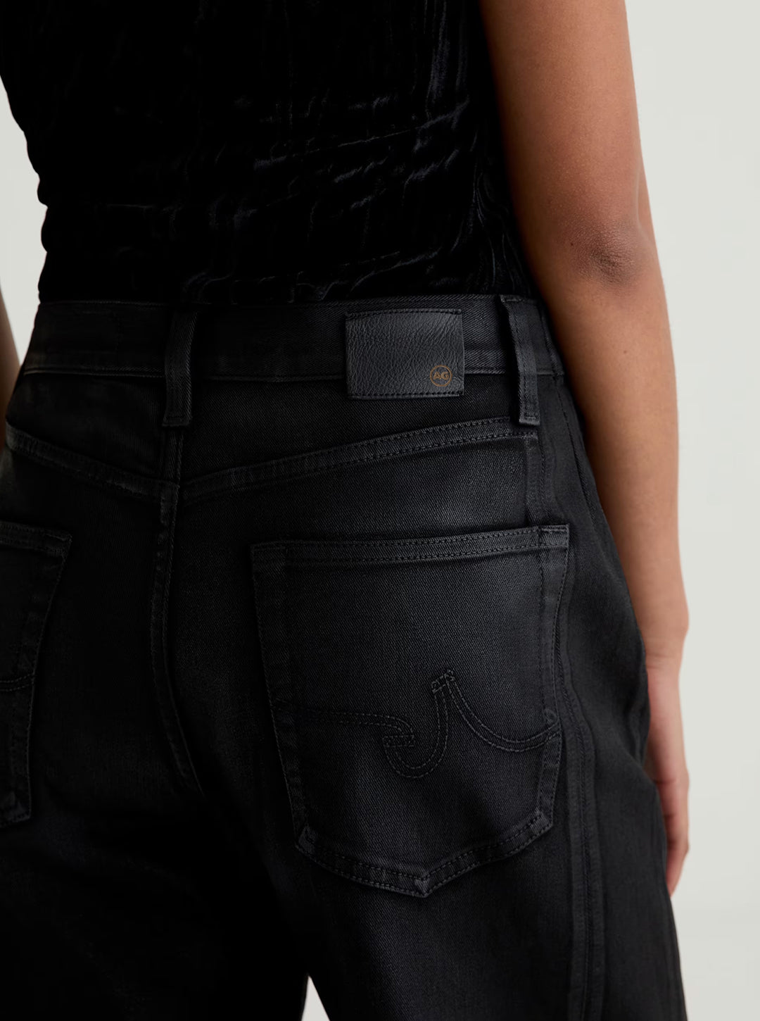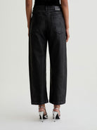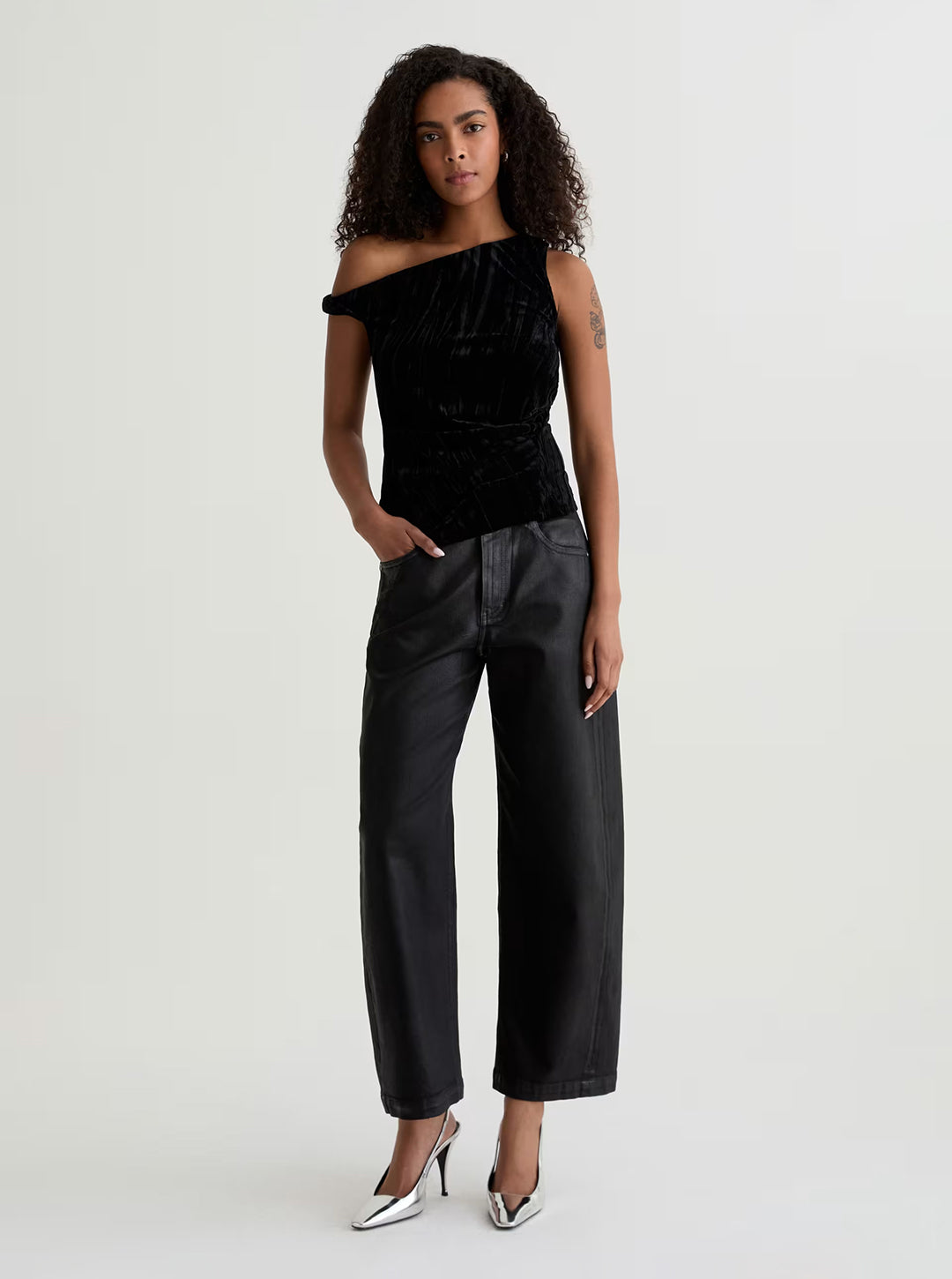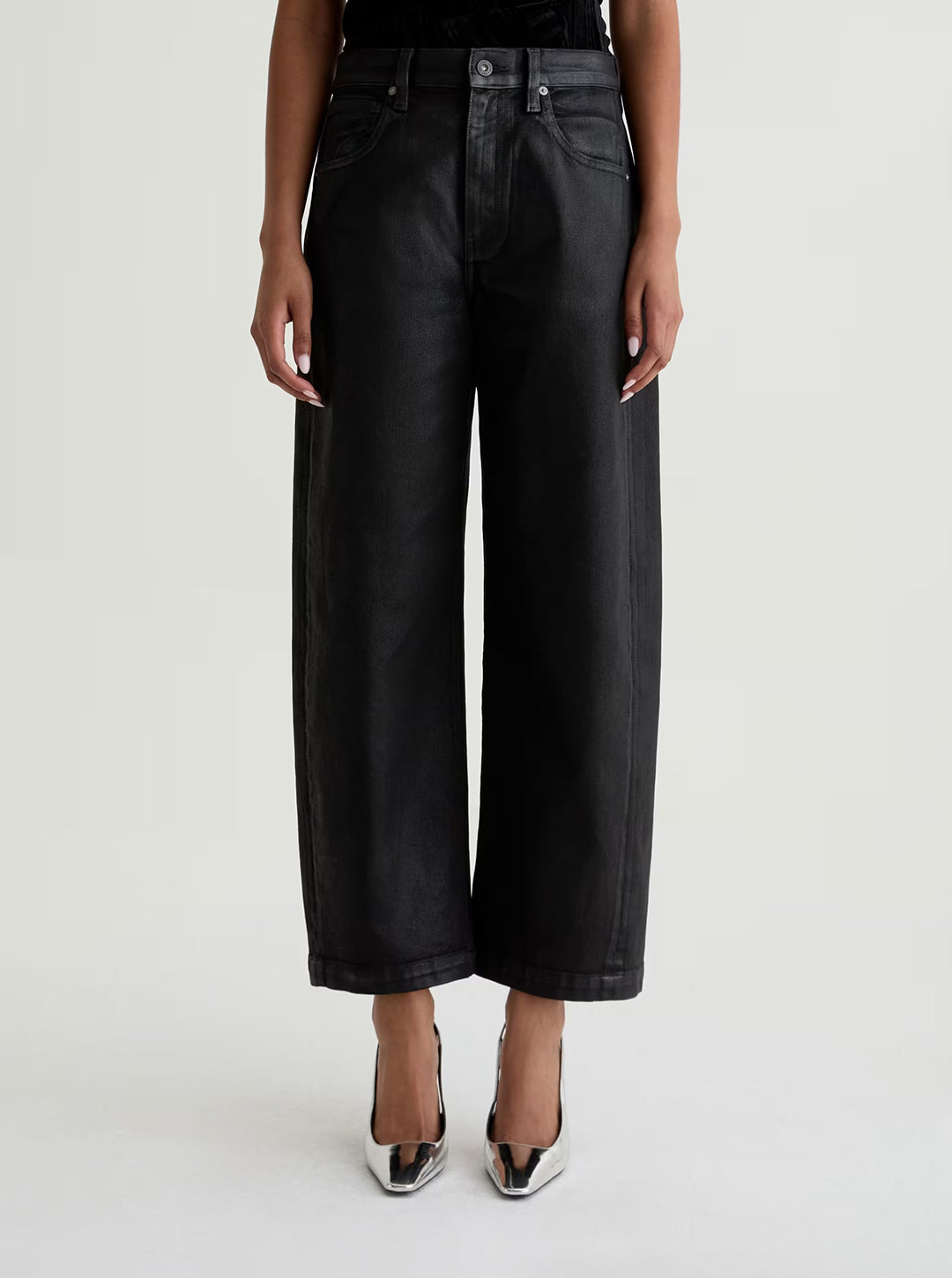 The Hattie Crop is a high-rise barrel jean featuring a curved leg that tapers toward a cropped hem, hitting just above the ankle for a modern finish. Crafted from AG Cloud Soft Denim™ in a versatile black wash with a sheen coat that was hand-finished with an exclusive Leatherette process.