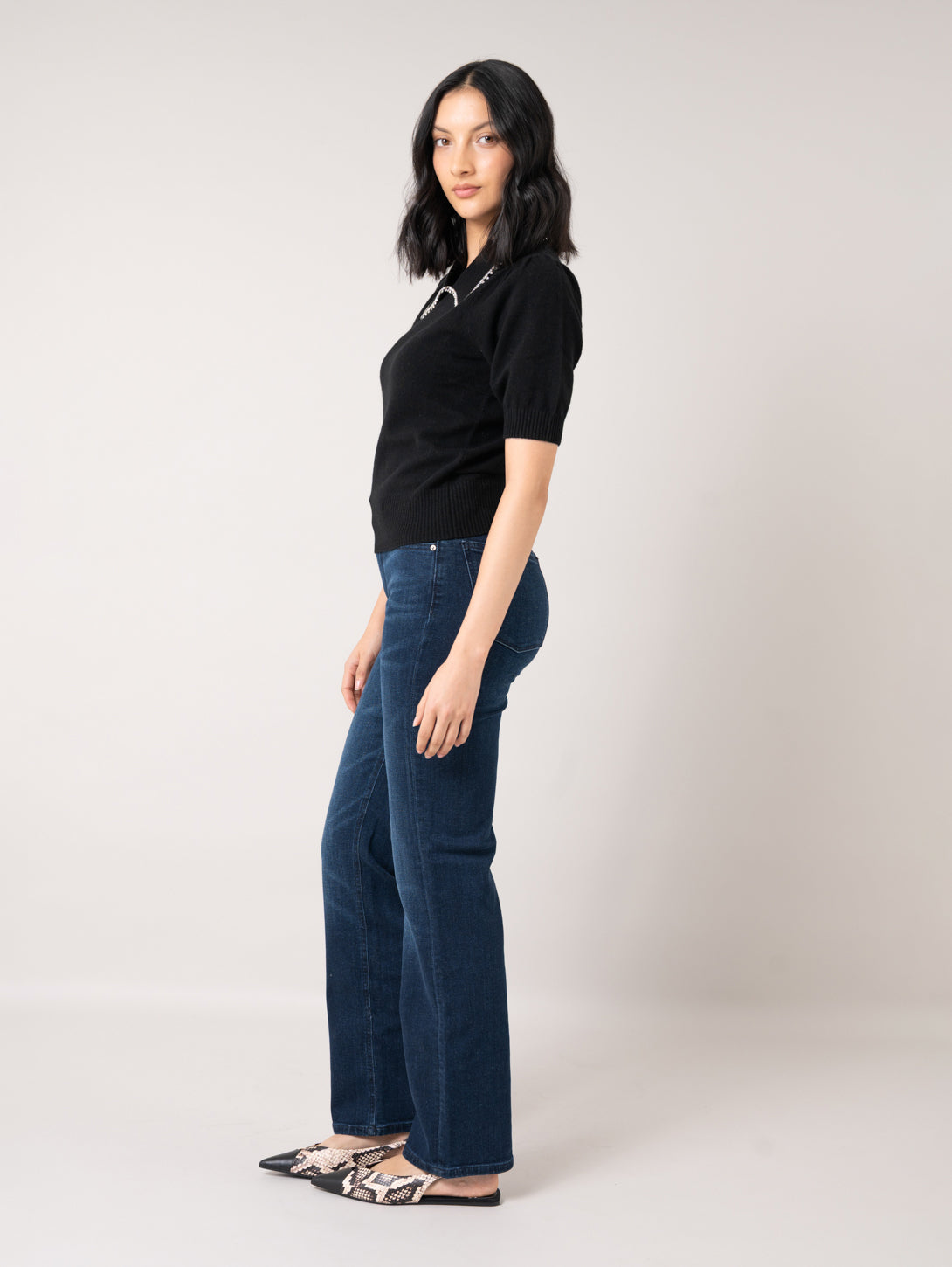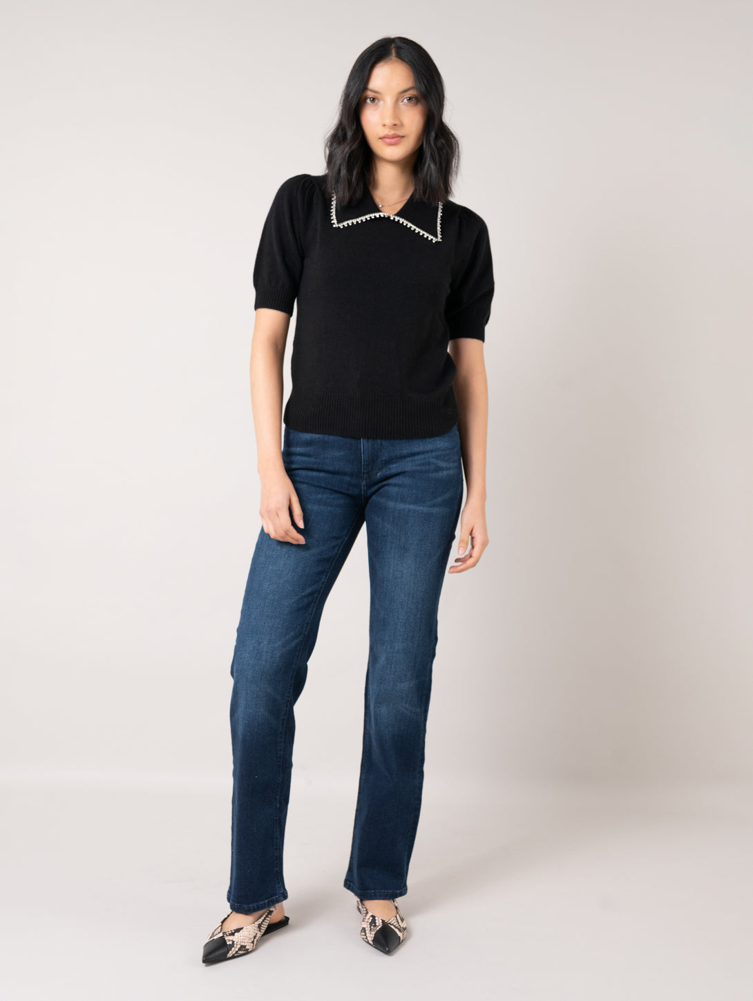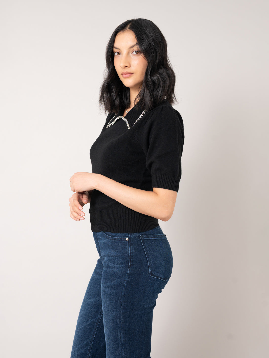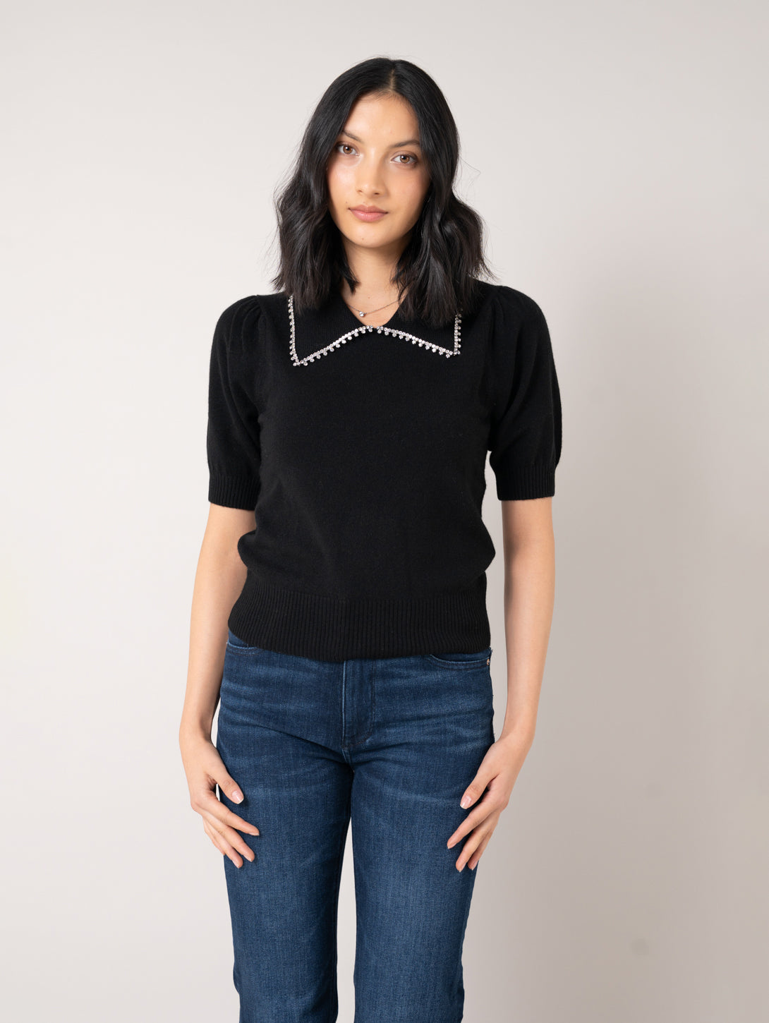 Peter Pan Collar Rhinestone Sweater - Black